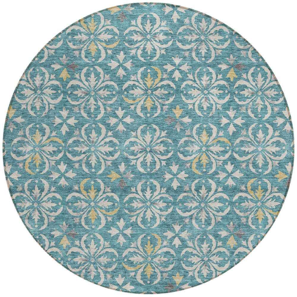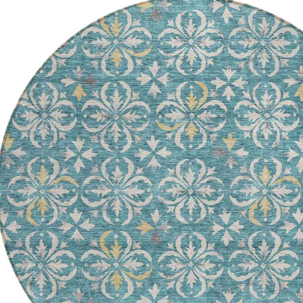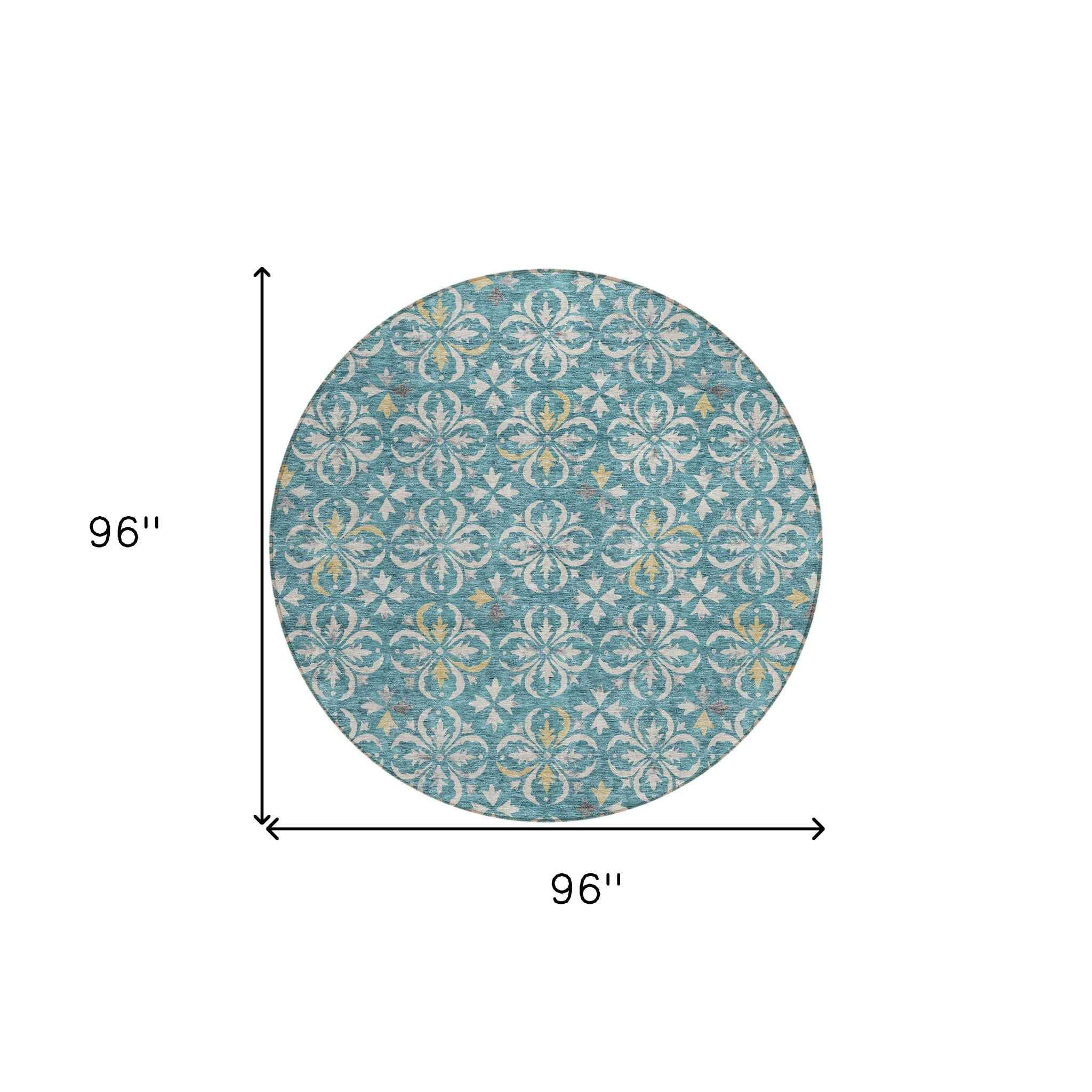8' Teal Blue Gray And Gold Round Floral Washable Indoor Outdoor Area Rug
