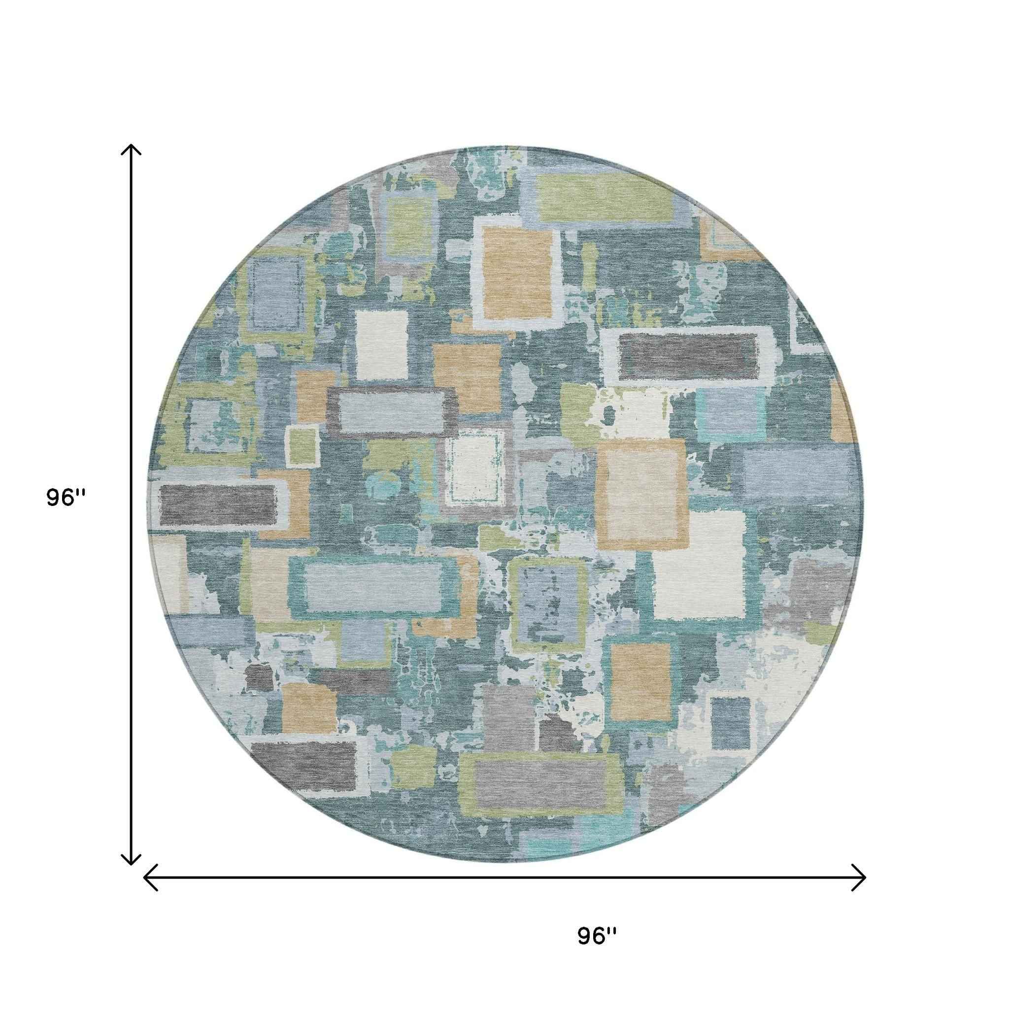8' Teal Blue Green And Ivory Round Geometric Washable Indoor Outdoor Area Rug