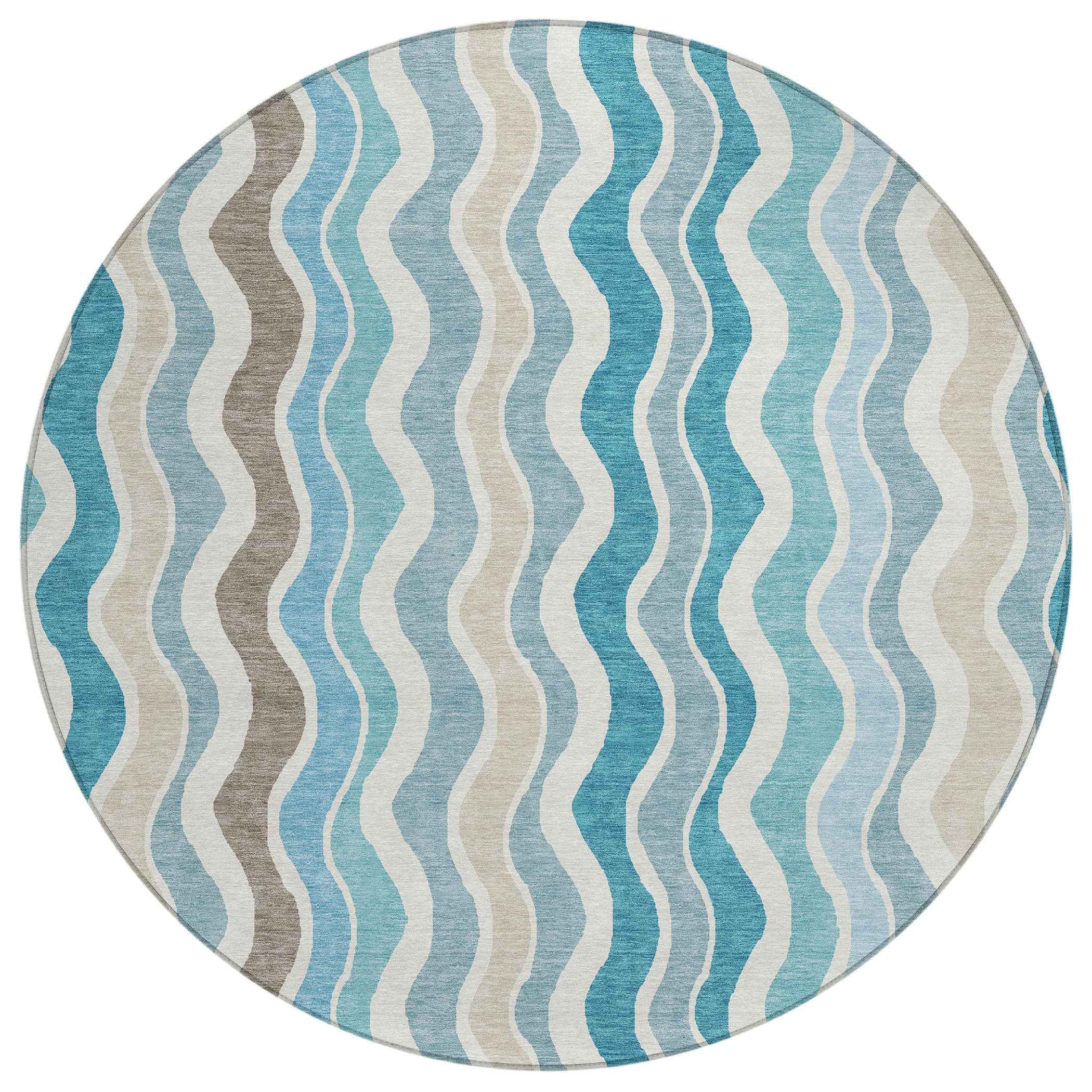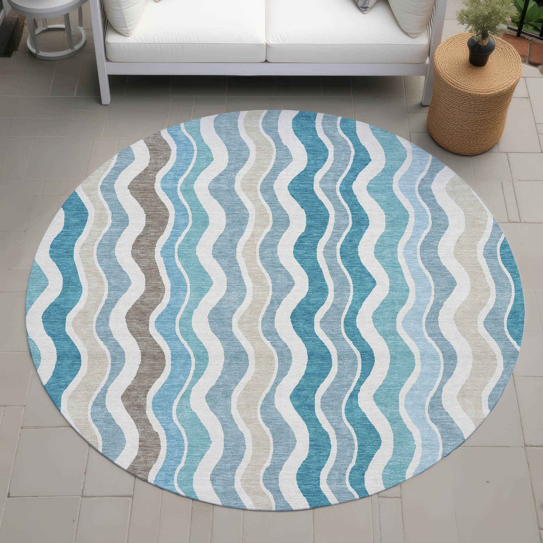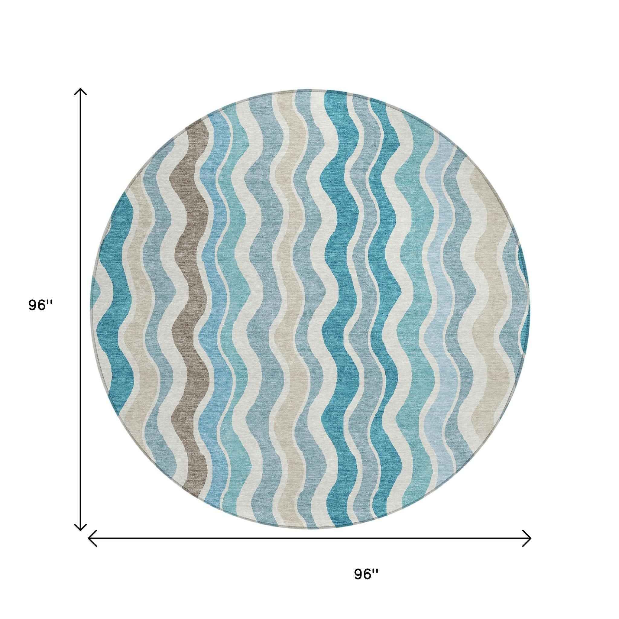 8' Teal Blue Ivory And Beige Round Striped Washable Indoor Outdoor Area Rug