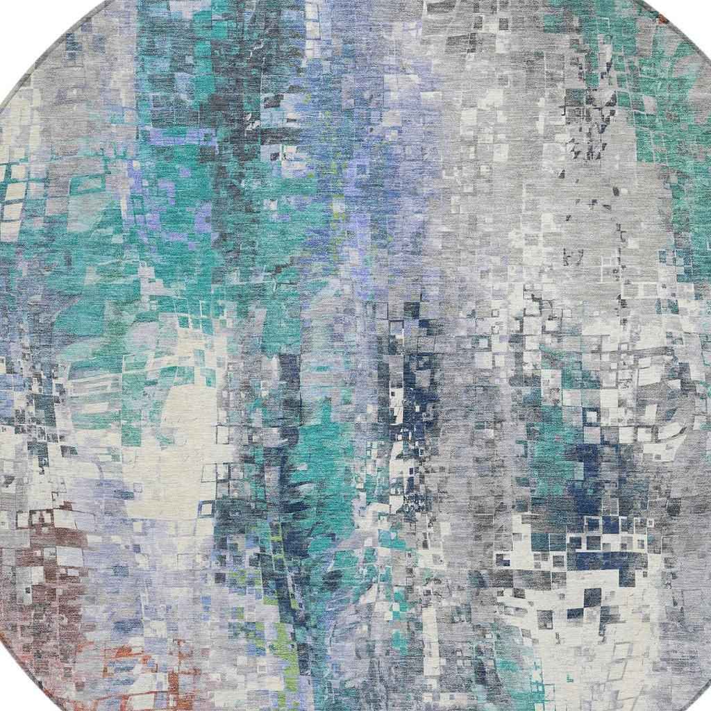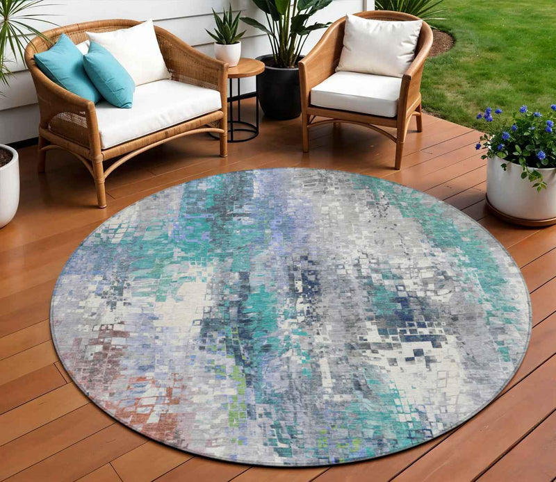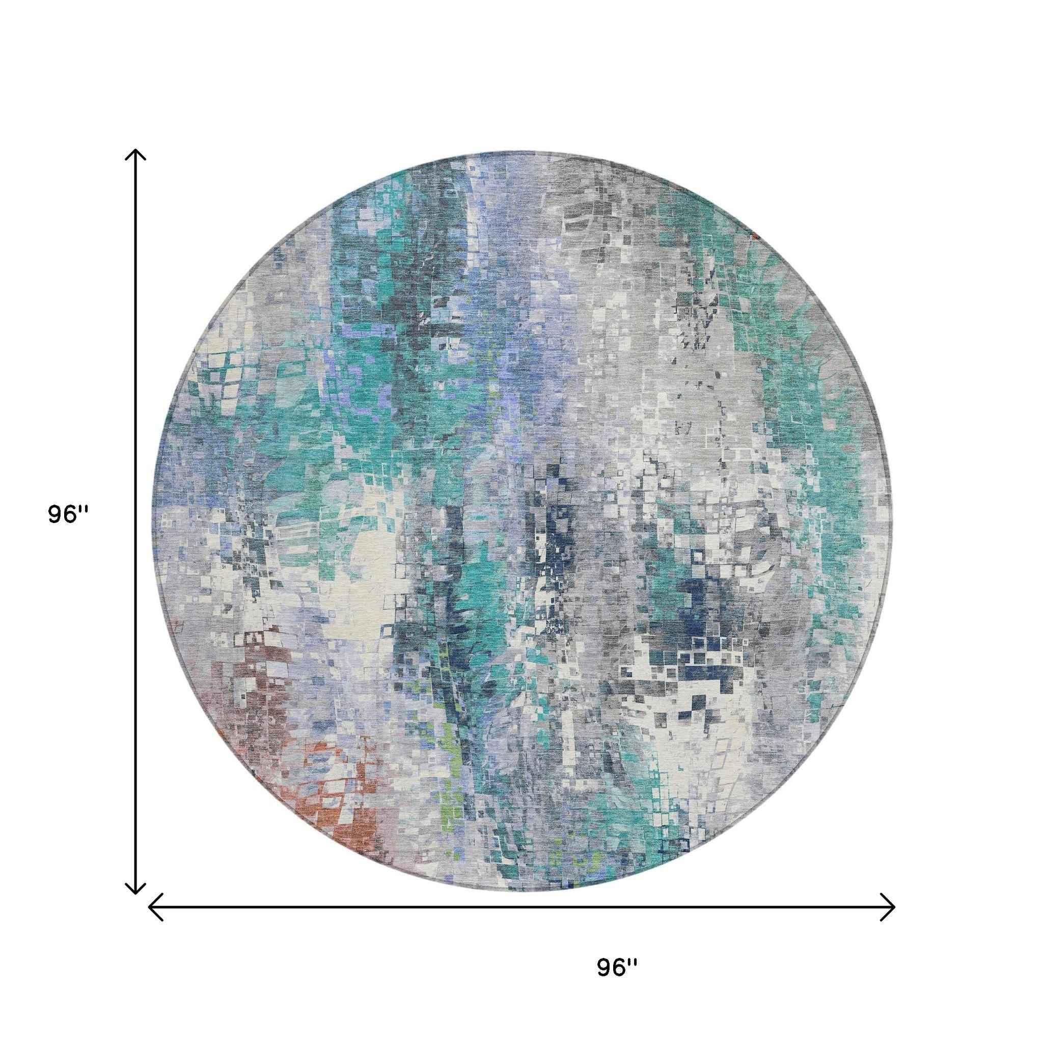 8' Teal Blue Ivory Gray And Copper Round Abstract Washable Indoor Outdoor Area Rug