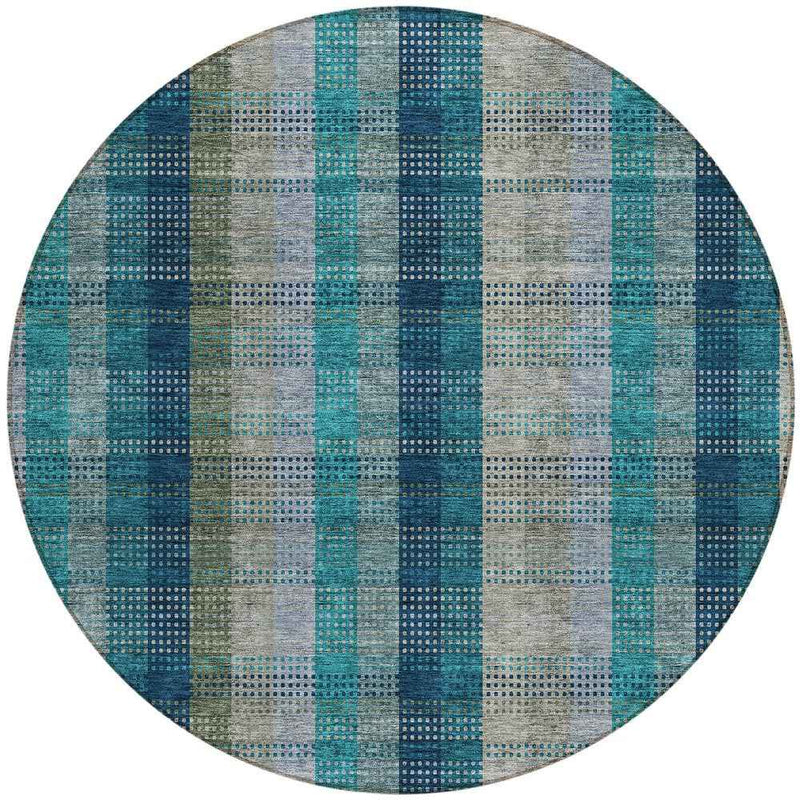 8' Teal Blue Navy Blue And Olive Green Round Plaid Washable Indoor Outdoor Area Rug