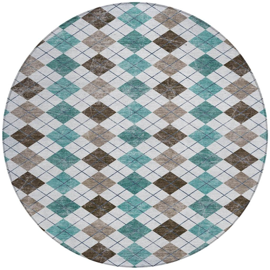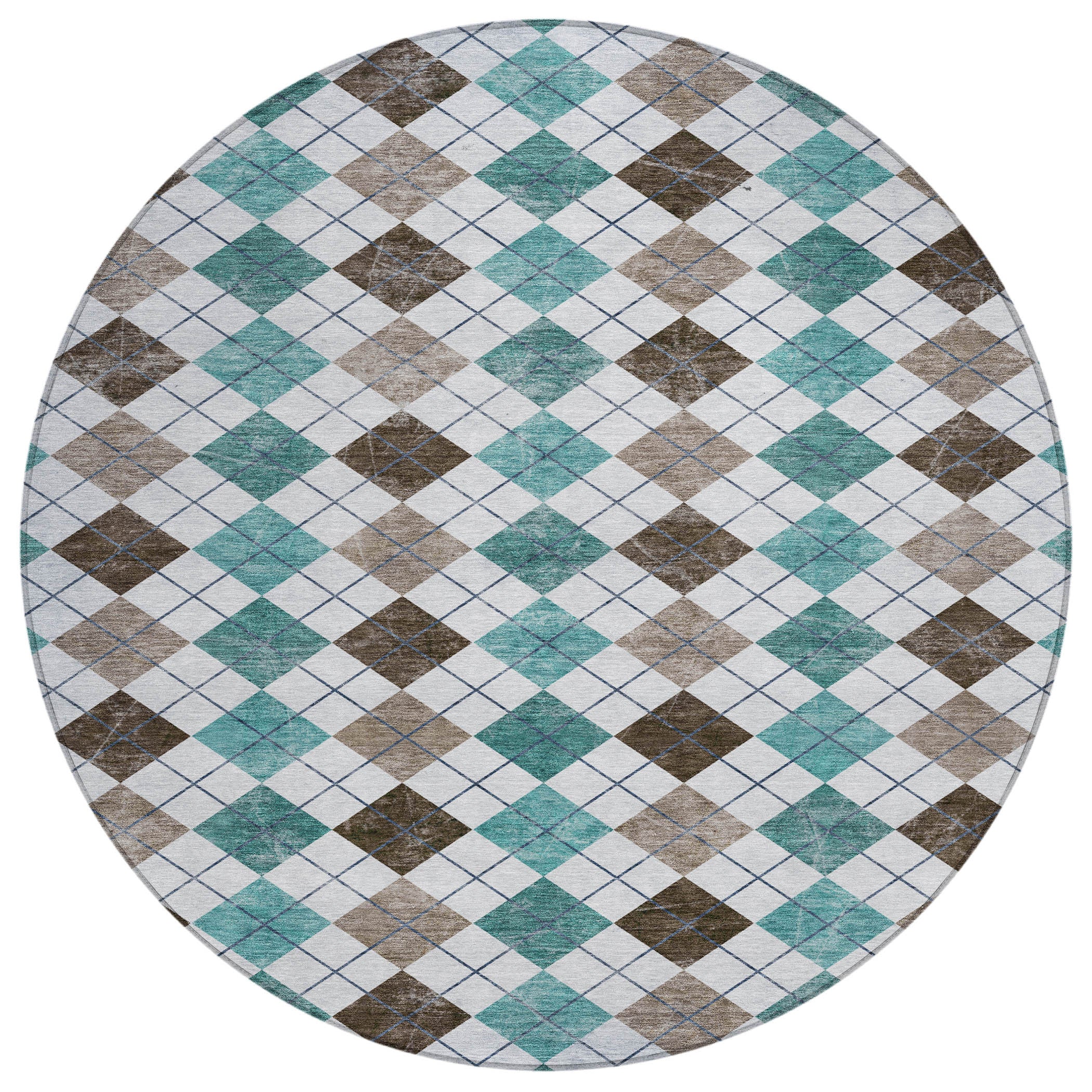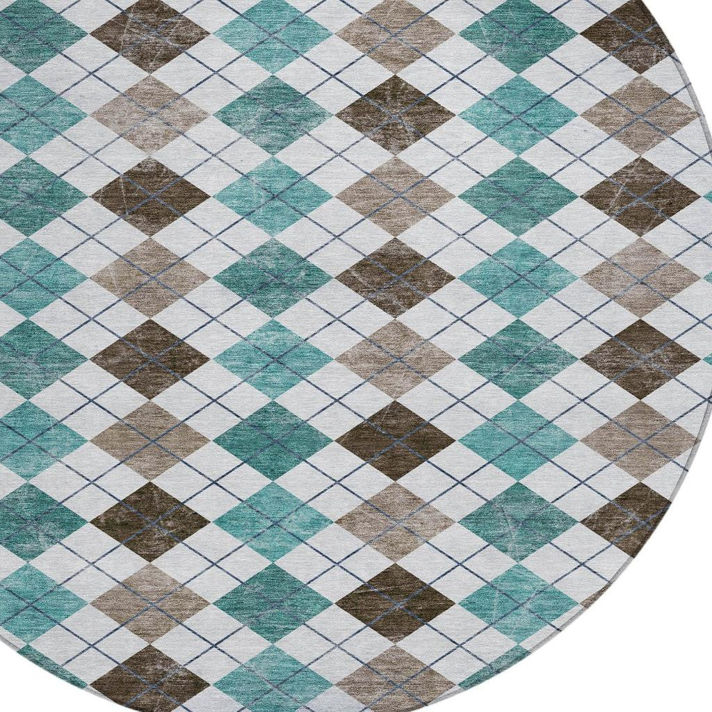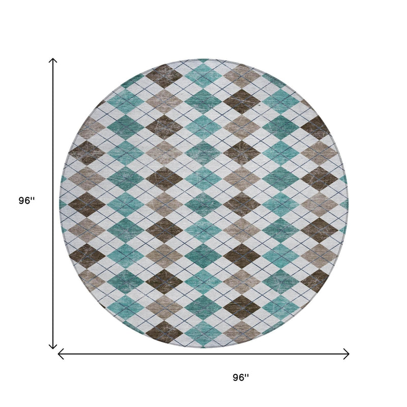 8' Teal Blue Taupe And Ivory Round Geometric Washable Indoor Outdoor Area Rug