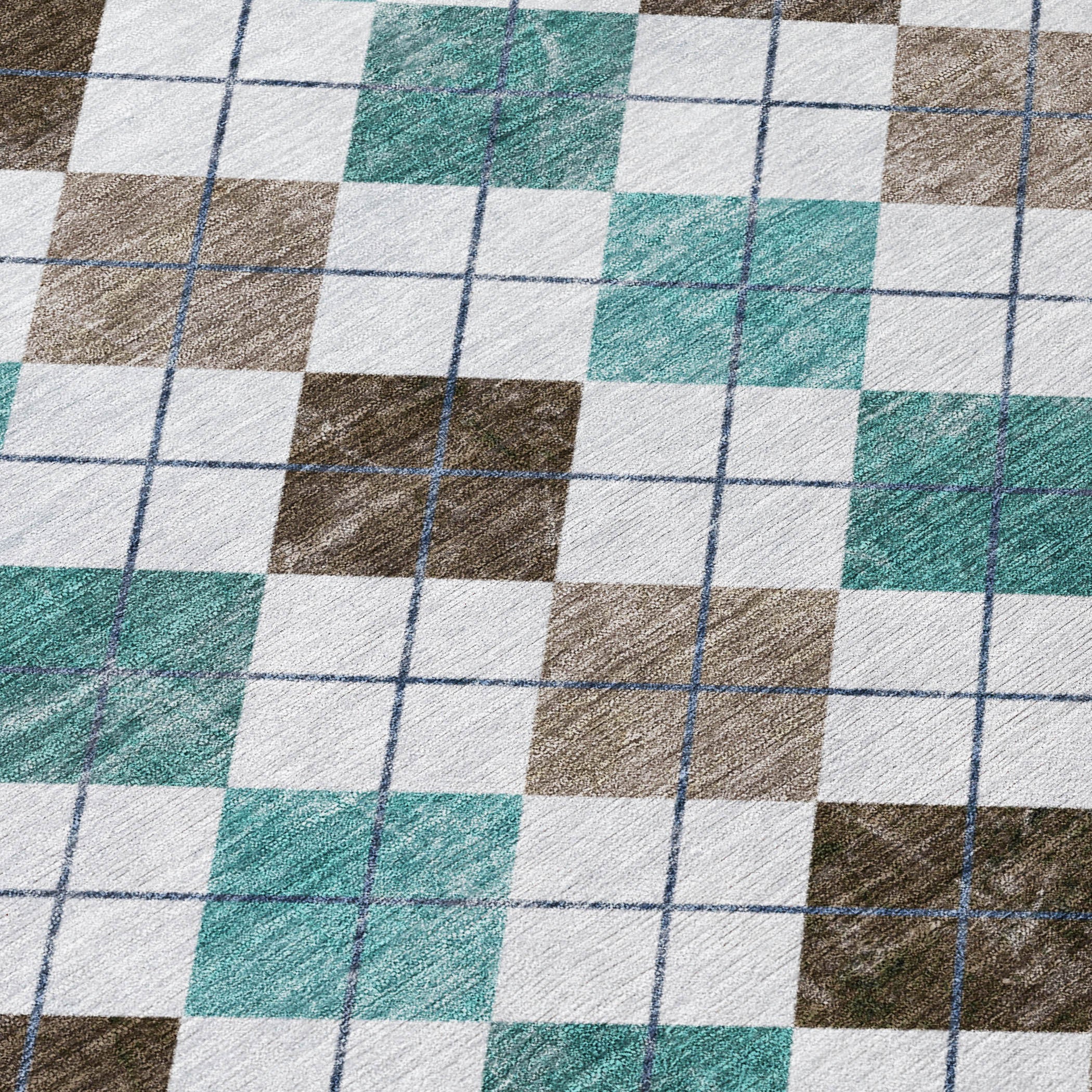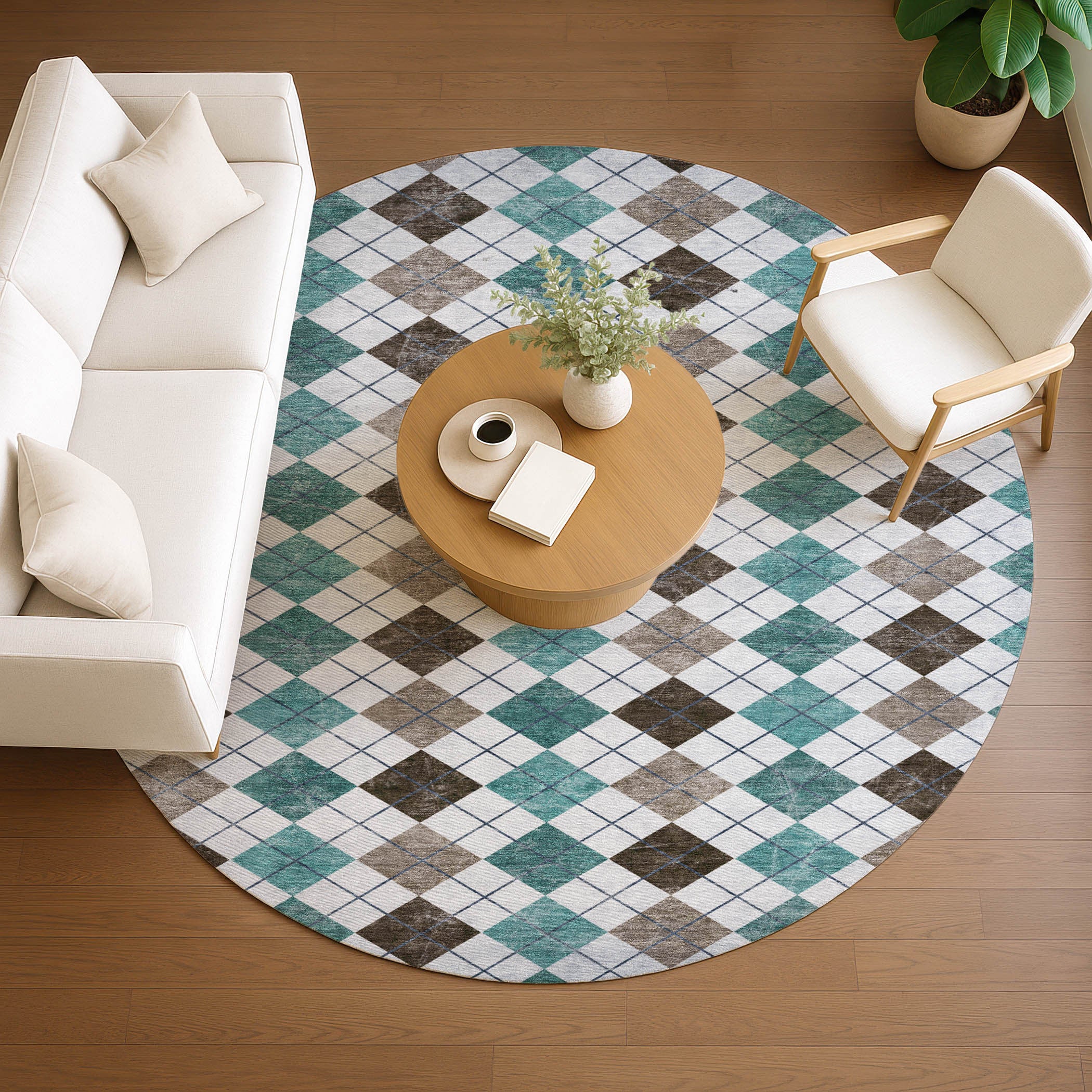 Set an inviting tone in your space with this 8-foot teal blue taupe and ivory round geometric washable indoor outdoor area rug. This geometric round shaped rug features a geometric pattern in teal blue, taupe, and ivory that combines a good looking print with a unique and updated shape. The mix of shape, color, and design gives this rug refreshing visual interest. Ideal for outdoor spaces or high traffic areas with kids and pets, this rug is made from heavy duty polyester that is stain resistant to help repel water, dirt, and stains. Versatile in use, durable, and easy to maintain, this rug is an ideal solution to add a decorative and inviting touch to your indoor or outdoor space. 96-inch h x 96-inch w x 0.19-inch d.