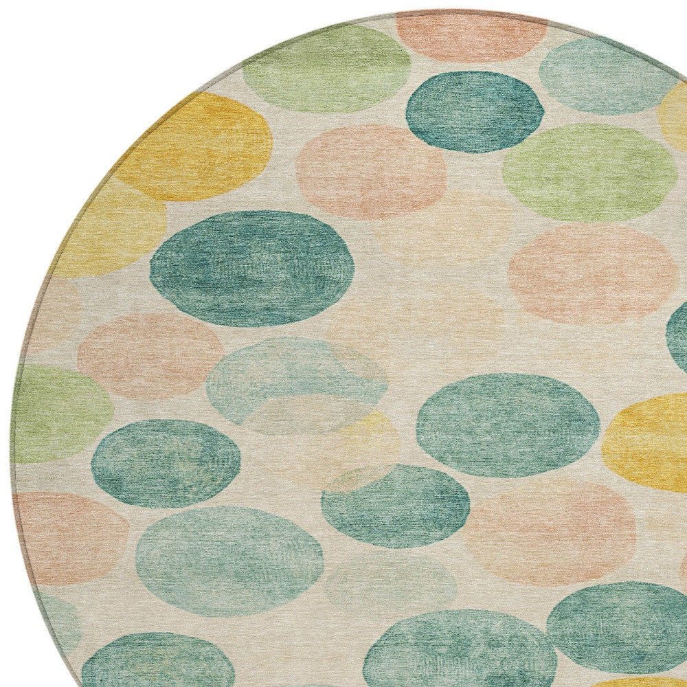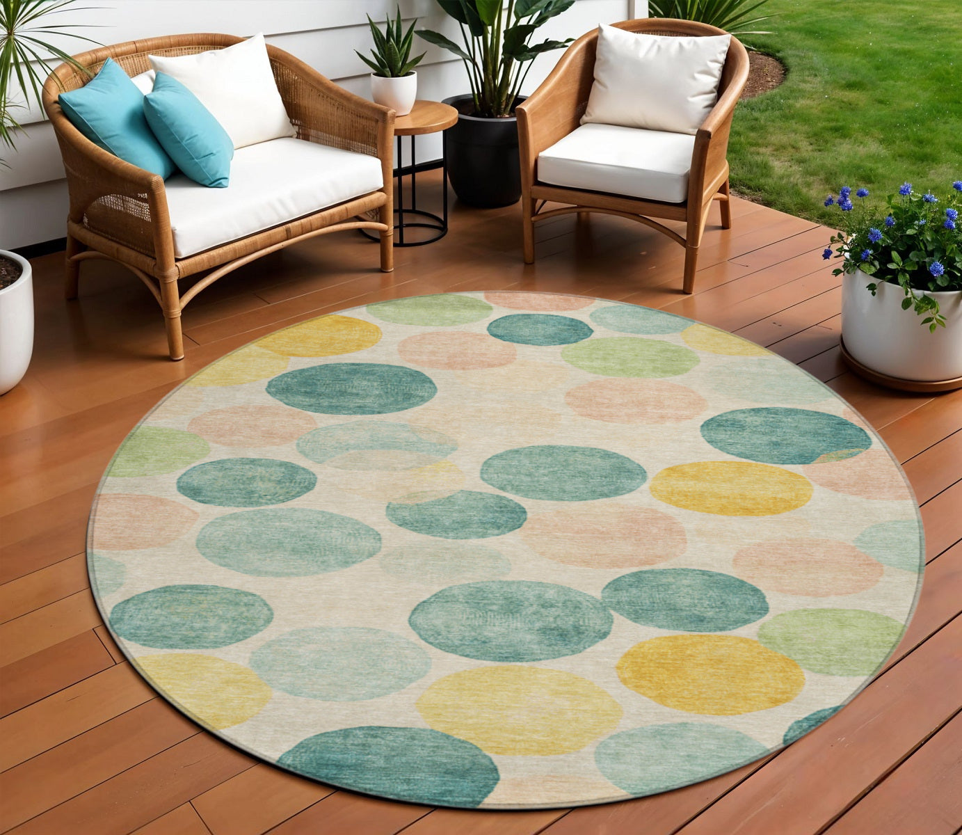 8' Teal Blue Yellow And Peach Round Geometric Washable Indoor Outdoor Area Rug
