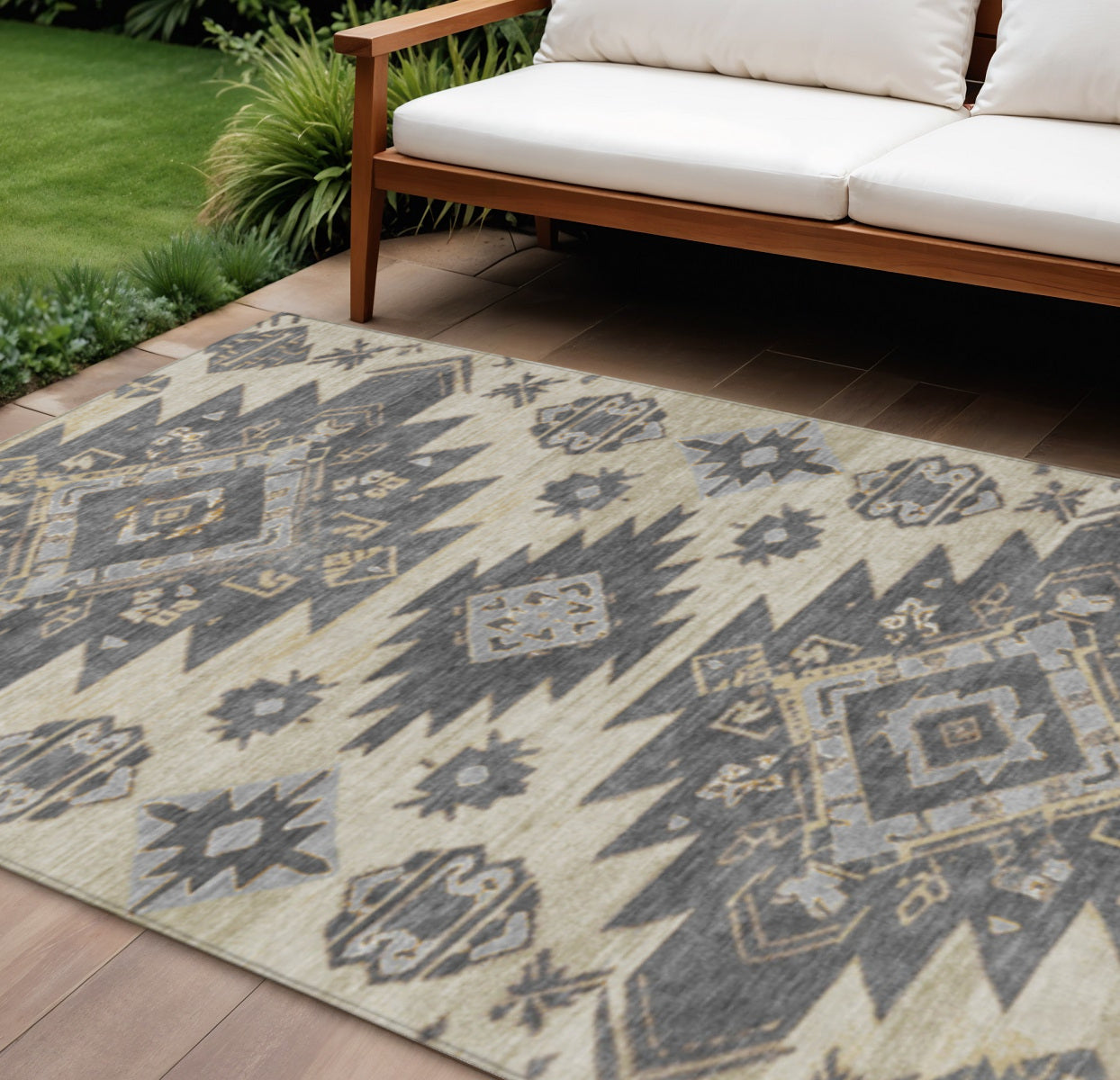 Set an inviting tone in your space with this 8-foot x 10-foot beige and gray tribal washable indoor outdoor area rug. This rectangle shaped rug features a tribal design that will work well both indoors or out. A classic shape marries with good looking design for your living room, hall, bedroom, porch, patio, or poolside. Ideal for outdoor spaces or high traffic areas with kids and pets, this rug is made from heavy duty polyester that is stain resistant to help repel water, dirt, and stains. Versatile in use, durable, and easy to maintain, this rug is an ideal solution to add a decorative and inviting touch to your indoor or outdoor space. 96-inch h x 120-inch w x 0.19-inch d.