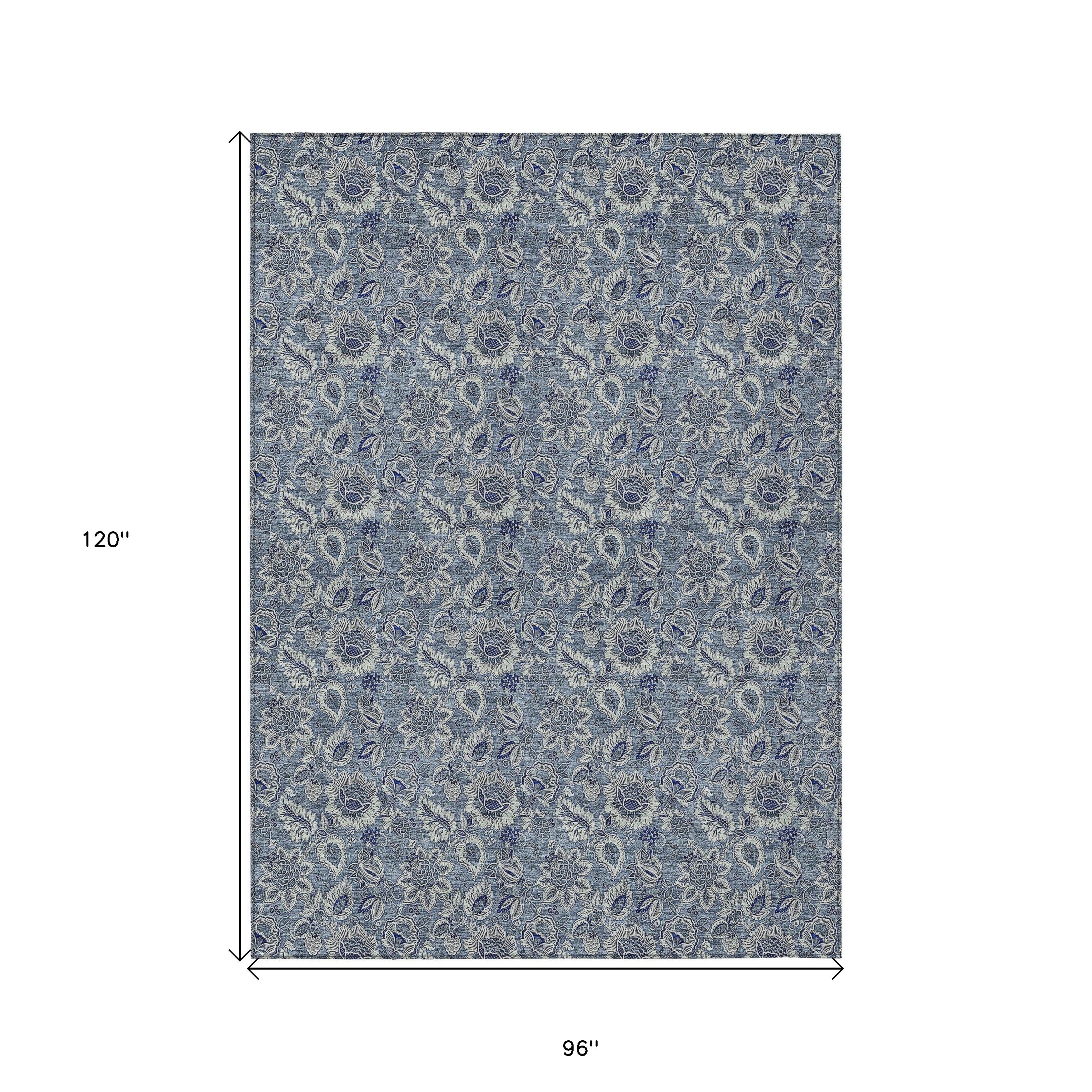 8' X 10' Denim Blue And Navy Blue Floral Washable Indoor Outdoor Area Rug