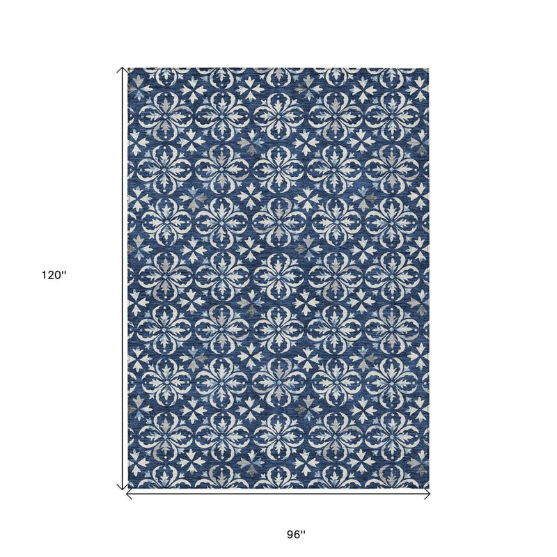 8' X 10' Navy Blue And Ivory Floral Washable Indoor Outdoor Area Rug