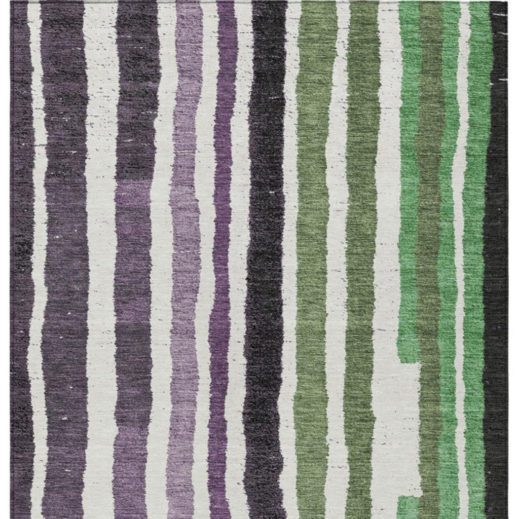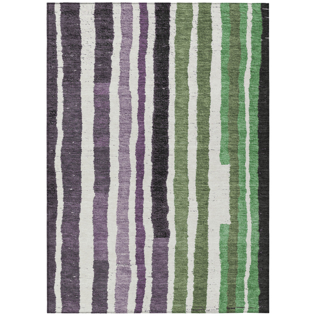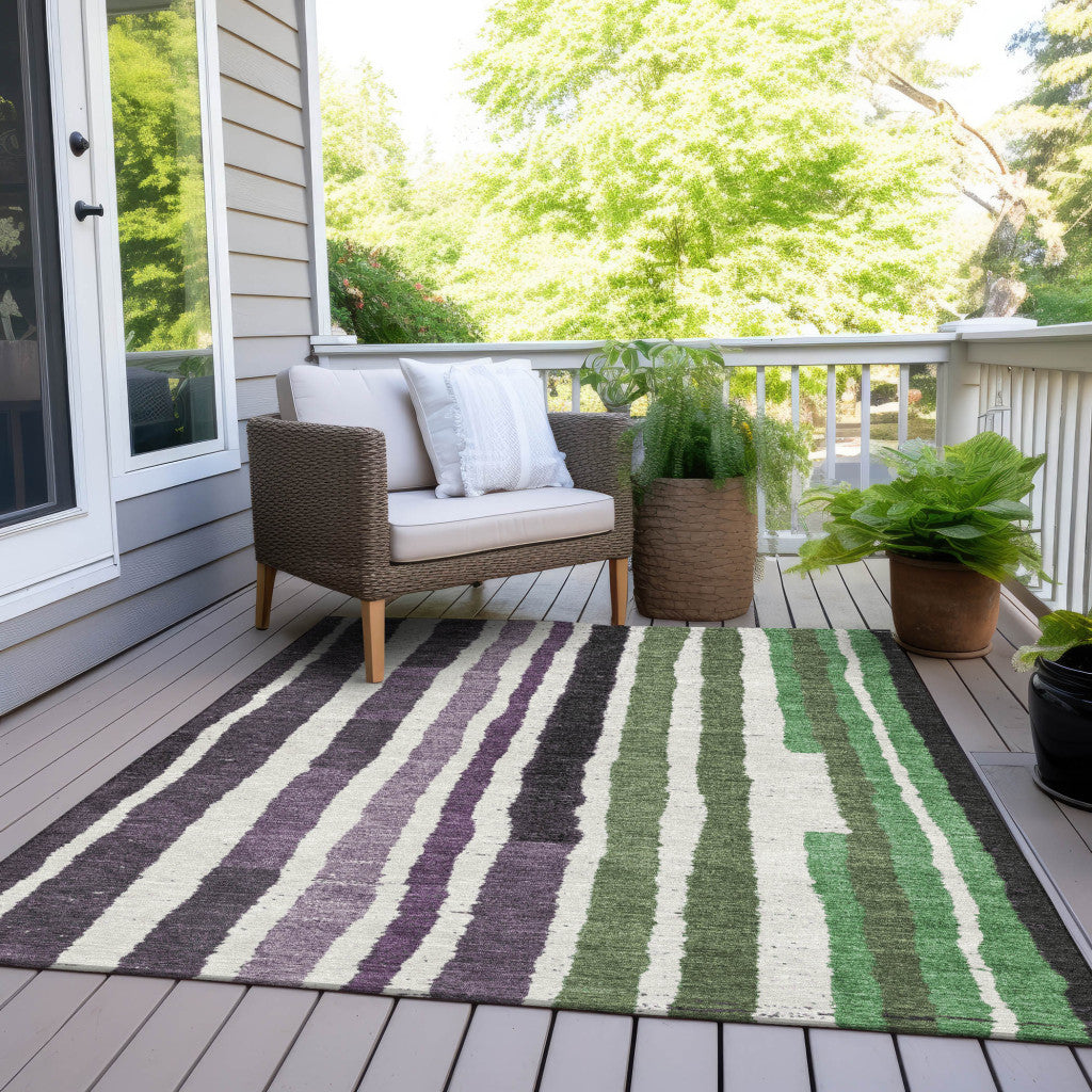 8' X 10' Purple Ivory And Green Striped Washable Indoor Outdoor Area Rug