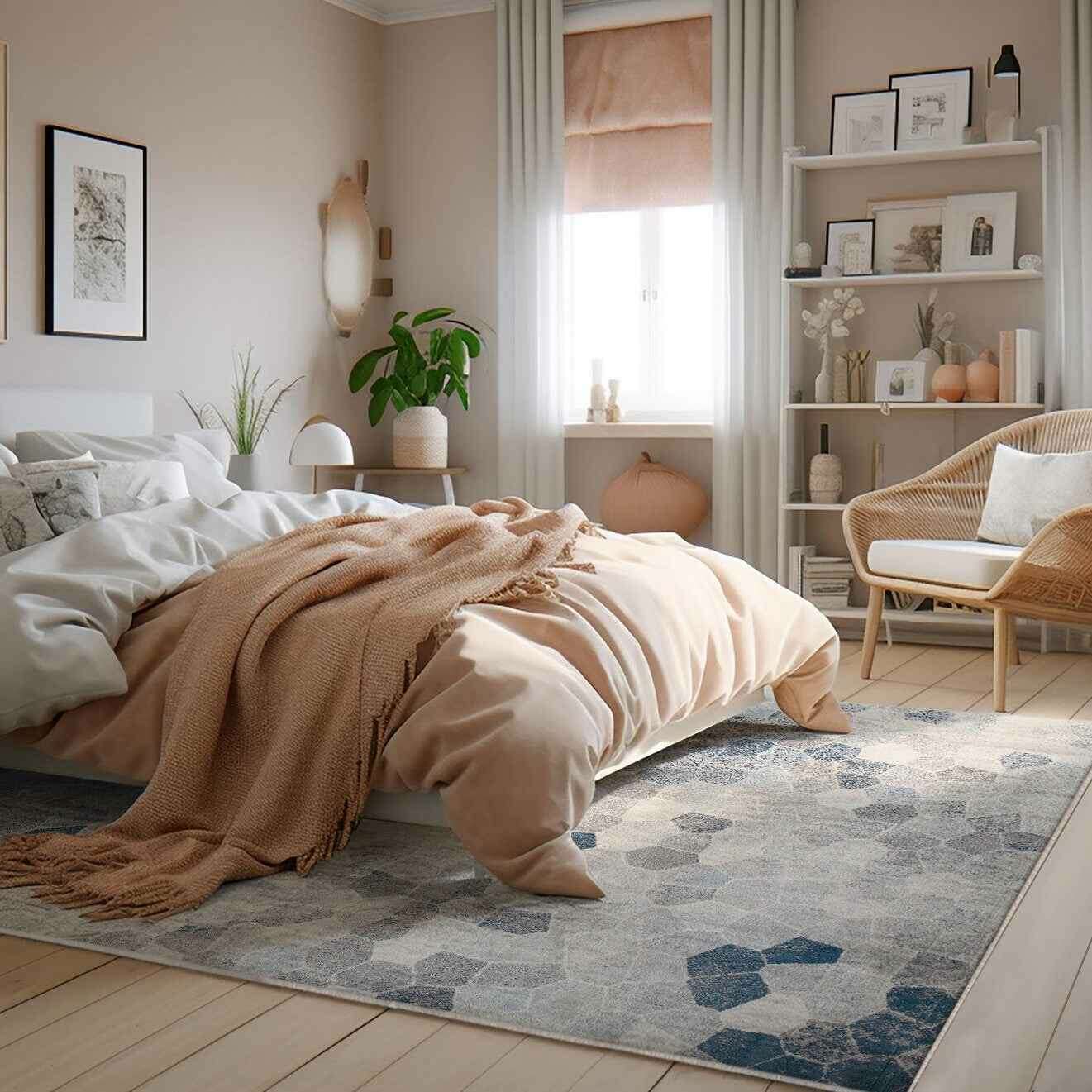 Emanating the essence of luxury and elegance, this Navy Blue Cobblestone Pattern Area Rug presents a beautifully sophisticated color palette to ornate any contemporary or casual setting. The fascinating fusion of navy blue, gray, and ivory offers a tasteful representation of a cobblestone pathway to set a relaxing and inviting tone. Skilfully crafted in Turkey with 100% polypropylene which is not only durable and easy to clean but also inherently stain-resistant to keep its sheen for years to come. The smooth and low pile construction adds to the surface interest for a rich and luxurious underfoot. Place this uniquely designed area rug against any hardwood or tile floor and it will stay put while tying together the aesthetics of its surrounding. 128” x 93” x 0.4”