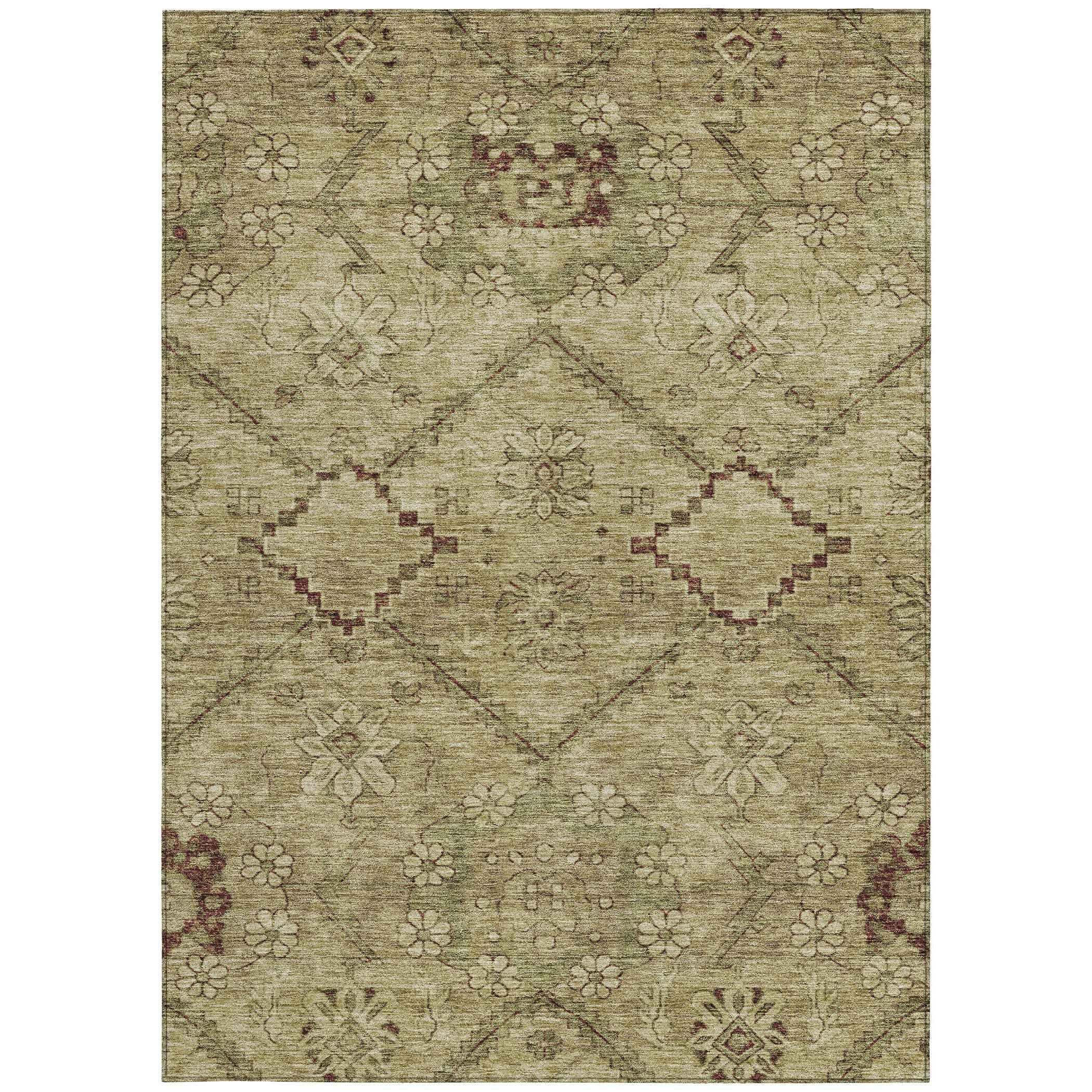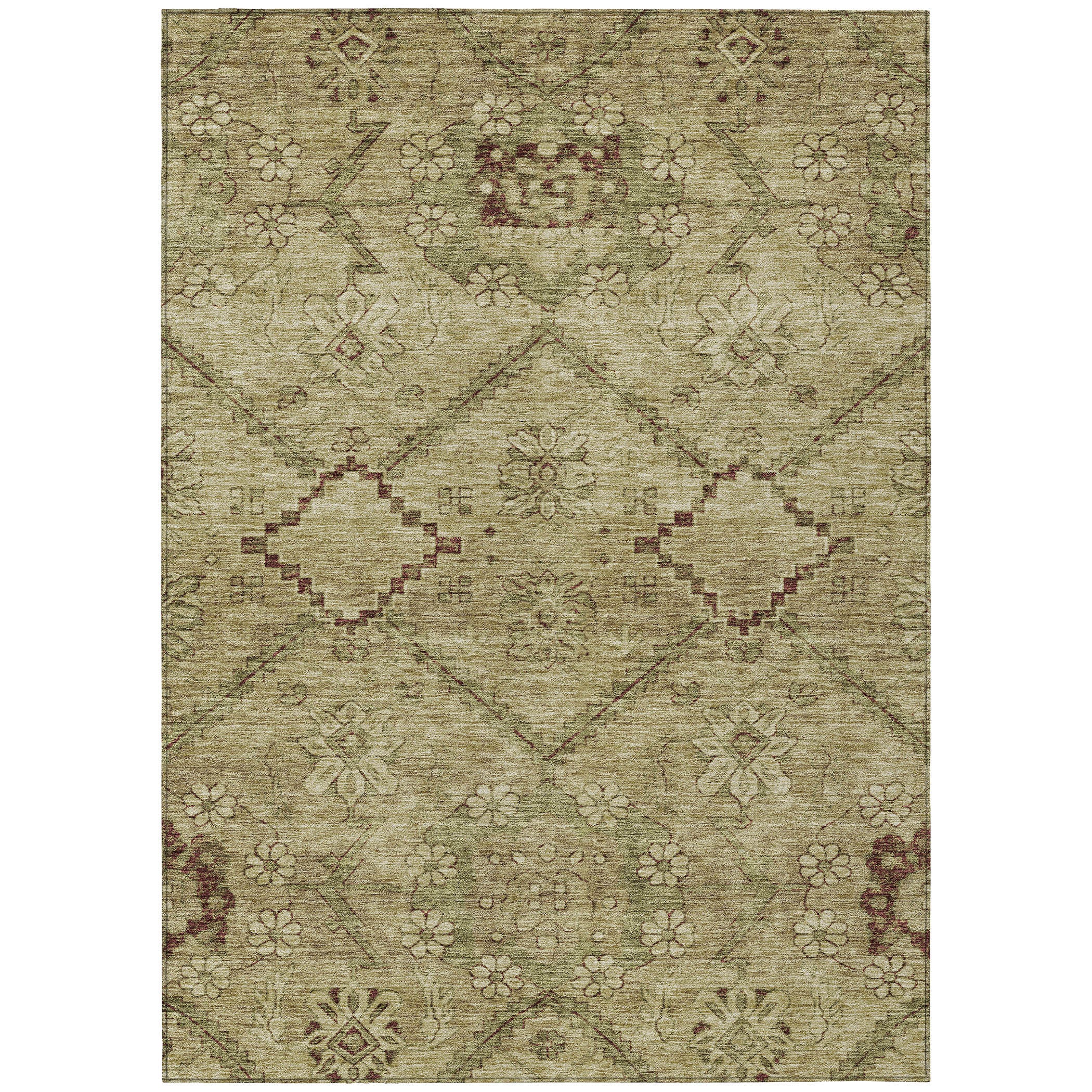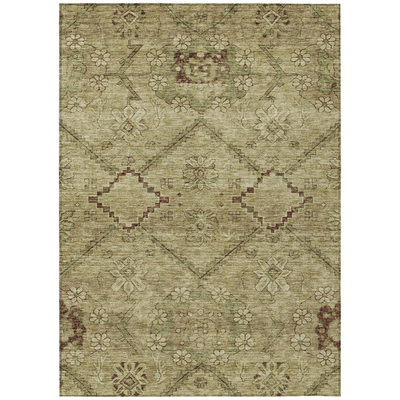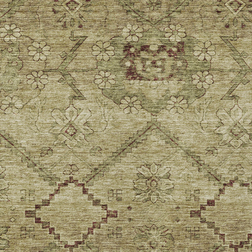 9' X 12' Brown Beige And Artichoke Green Floral Washable Indoor Outdoor Area Rug