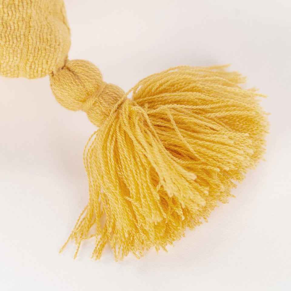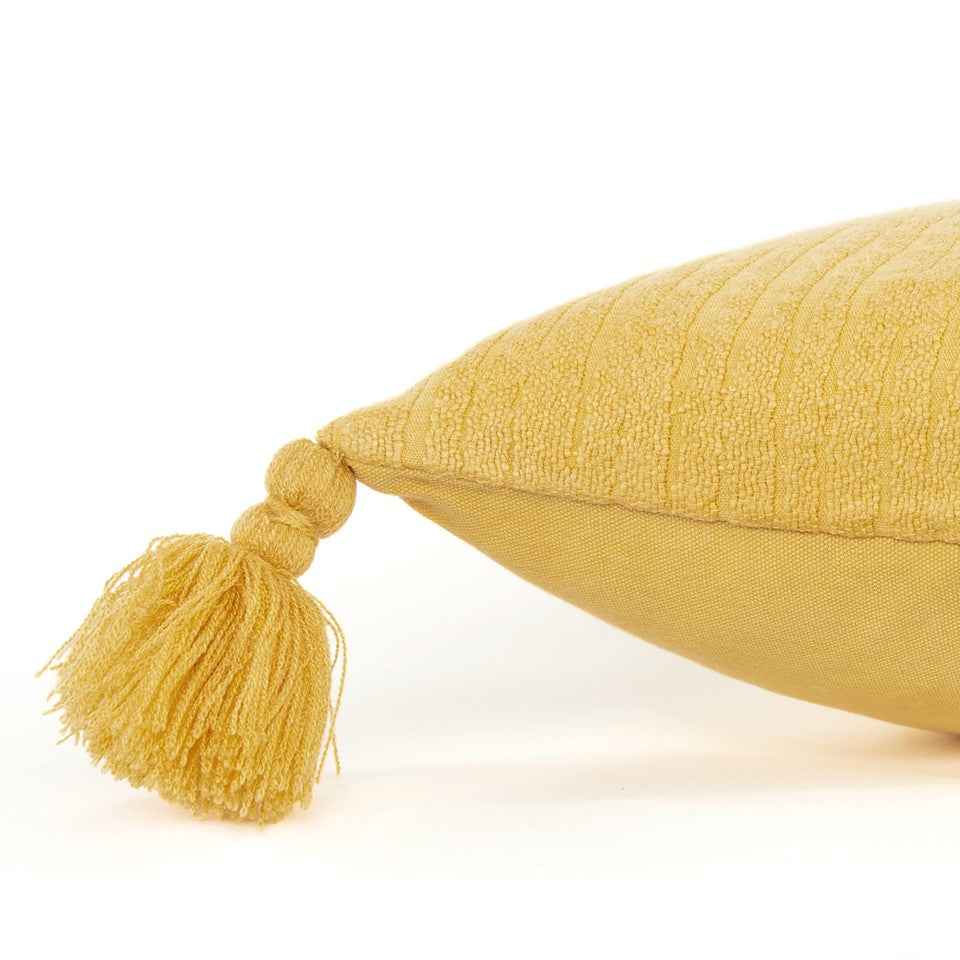Sophisticatedly modern with a bohemian flair, this Gold Solid Tonal Abstract Stripe Throw Pillow is an episode of style and simplicity to spruce up your living space. The solid golden yellow base features slightly raised abstract stripe patterning for texture while the four cotton corner tassels add a cheerful element to the pillow. Crafted from top-quality cotton fabric for enhanced durability and the polyfill insert makes it super soft, fluffy, and cuddly. The knife edging on the pillow ensures a clean and modern look to make it a suitable accent for a variety of interior styles. The solid coordination back sports a hidden zipper closure for convenience. Give your modern home a stylish visual appeal with this decorative throw pillow on the sofa or couch. 20” x 20” x 6.25”