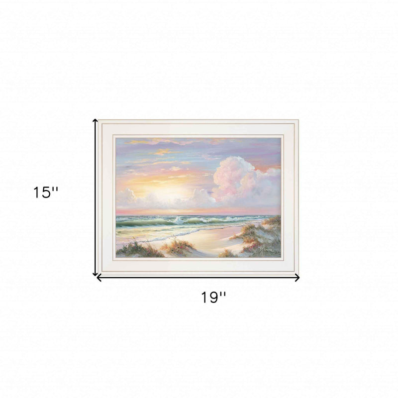 The golden sunset on crystal cove 1 white framed print wall art is the perfect decorative accessory for your home. This print is a visual artistic expression that allows you to decorate your space in style. Reproduced for you on paper, this hanging decorative accent will be a trendy and fashionable way to dress your walls. Hang on your wall to add some up to date fashion and decoration. Utilize this opportunity to create a focal point in the room with this fabulous wall decor option. 15 inches H x 19 inches W x 1 inches D