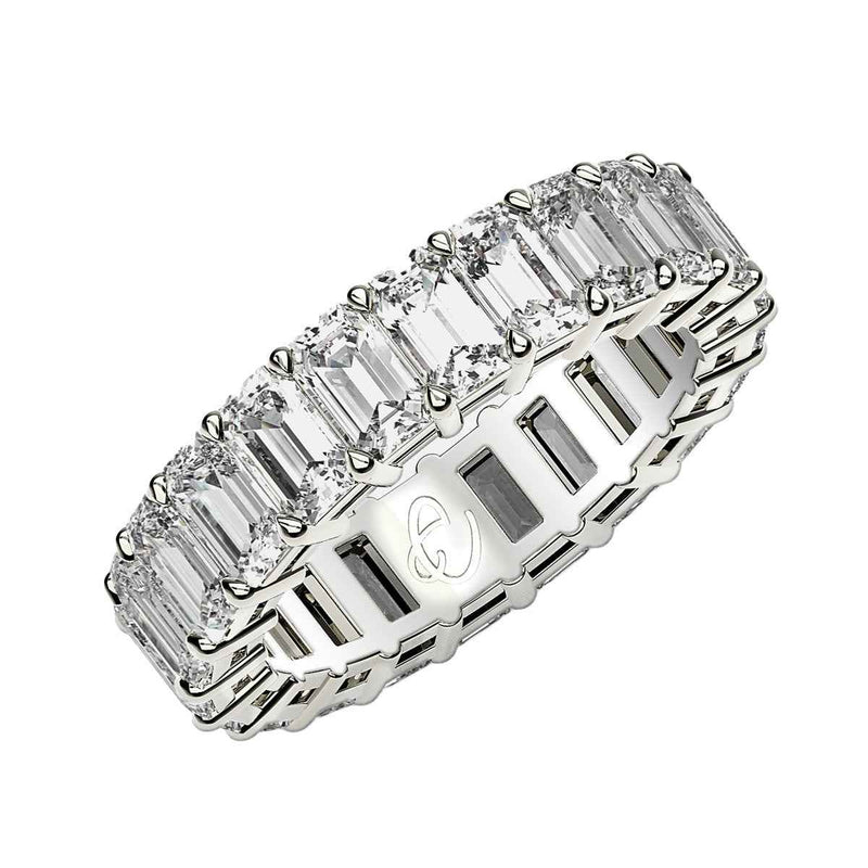 This dramatic eternity band features the traditional shine of 14k white gold, and the unparalleled sophistication of beautiful prong-set emerald cut lab grown diamonds. The light it radiates is as eternal and bright as the emotion it symbolizes. This ring belongs to the Eternity Us collection.