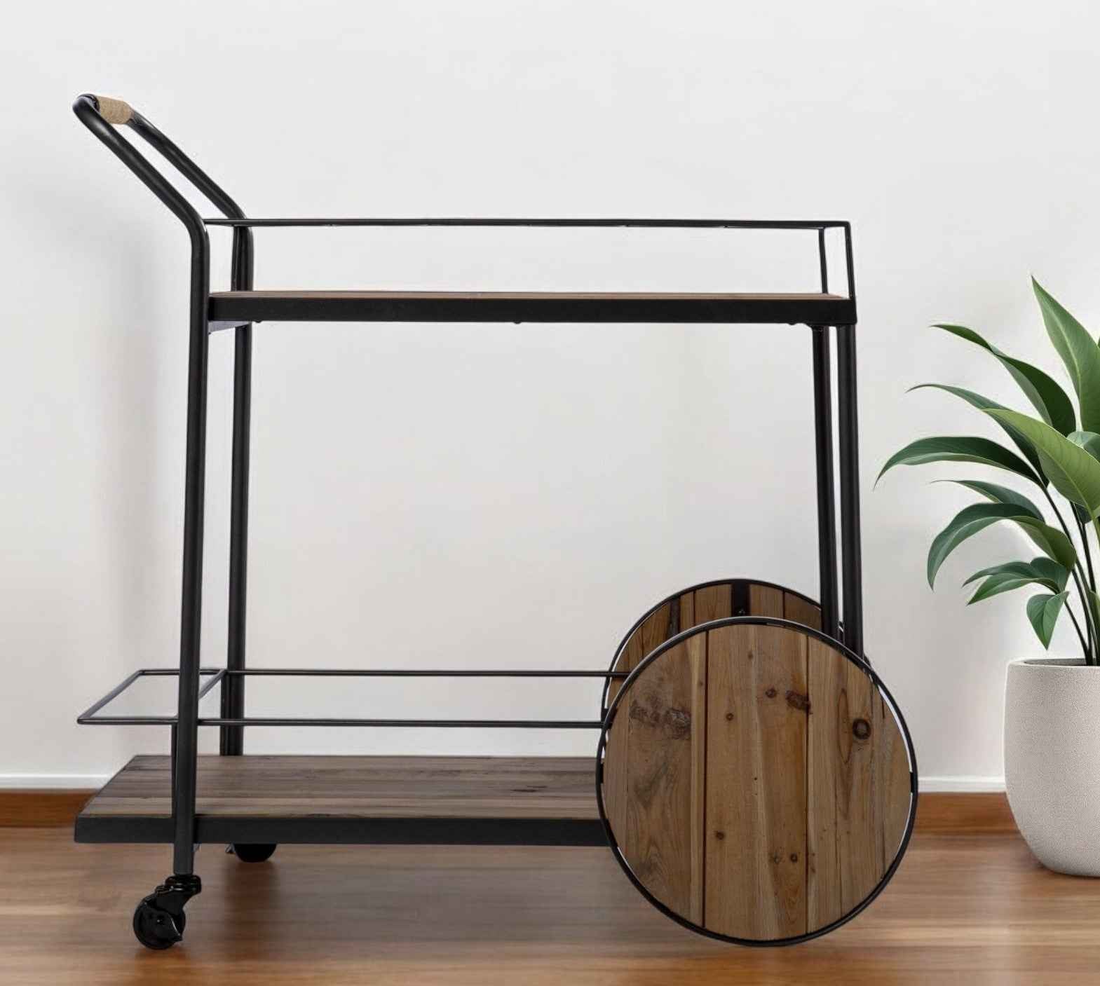 Natural and Black Iron And Reclaimed Wood Rolling Bar Cart With Wine Storage