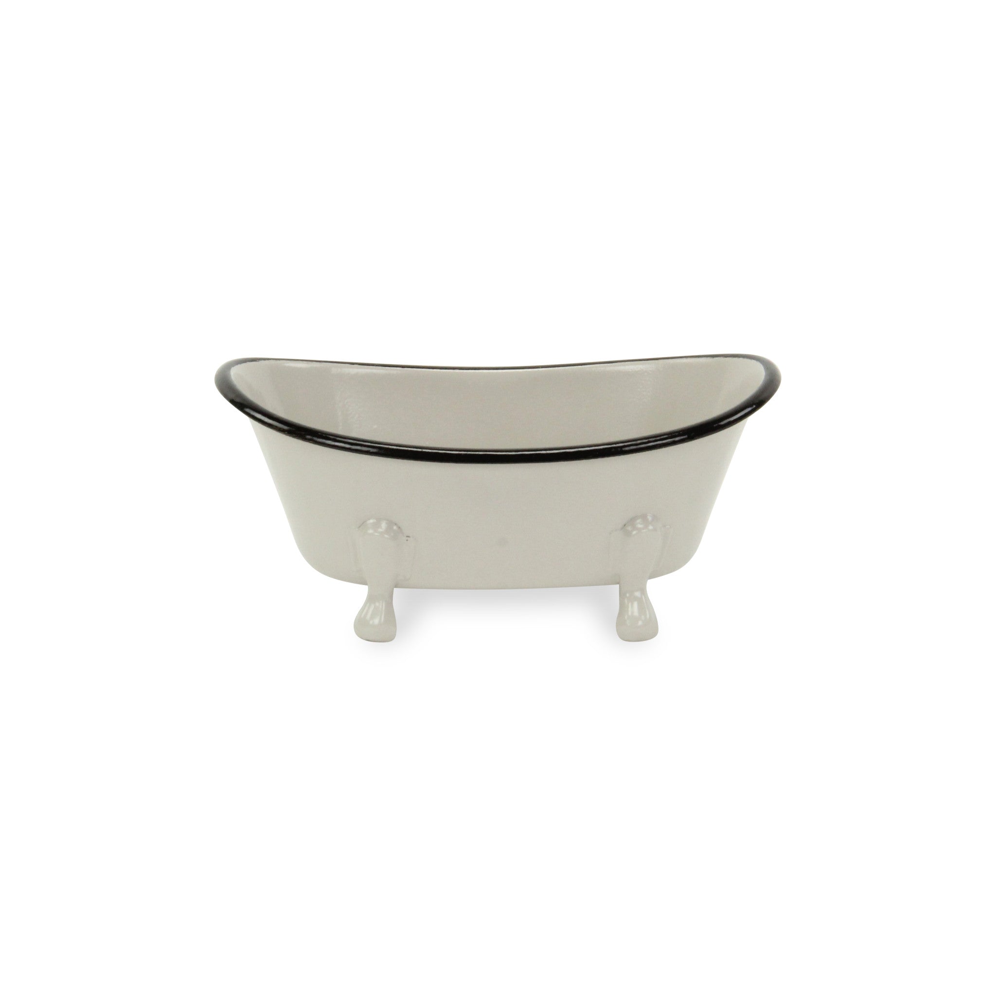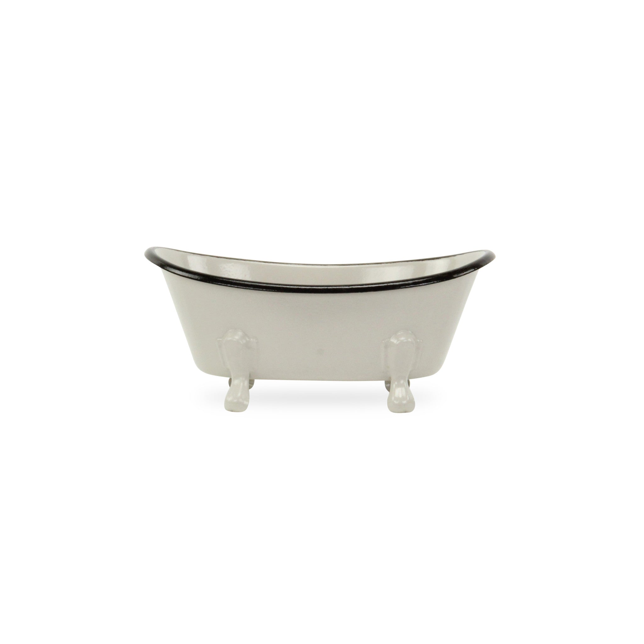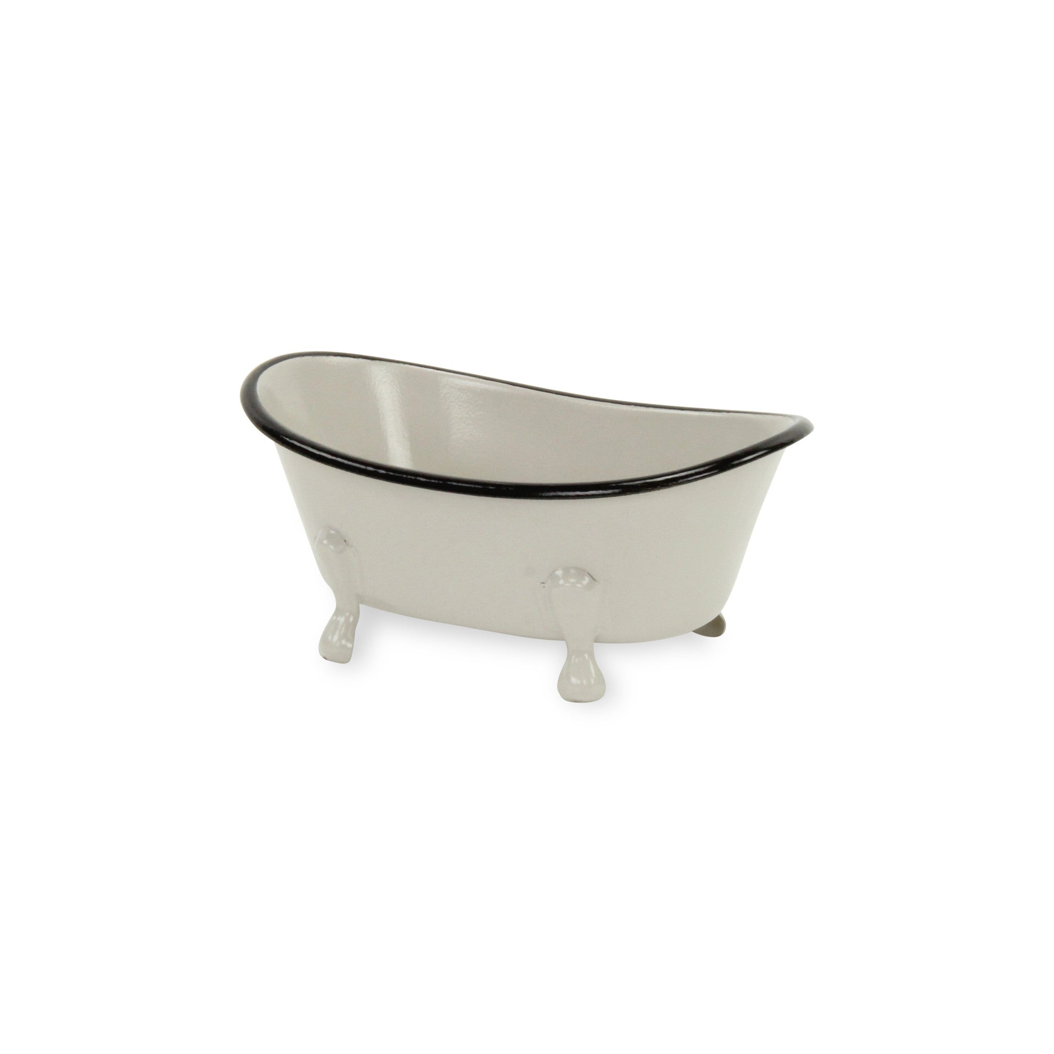 Add a whimsical touch to any space in your home with this Petite Light Gray Bathtub Decorative Sculpture. This piece is made from solid metal and is colored to a light gray finish. The claw foot bathtub shape has a black colored rim and four feet underneath which add a nice depth to the overall look. You can use this piece as decor around your home or you can line in with plastic and use it as a fun planter outdoors or indoors. 3.25" H x 7" W x 4" D