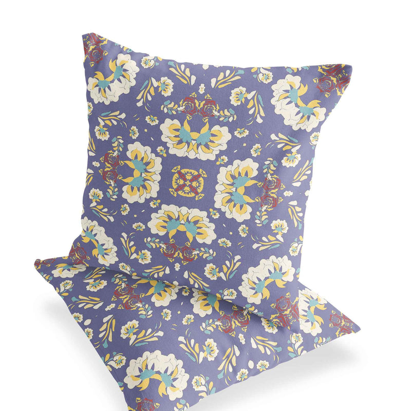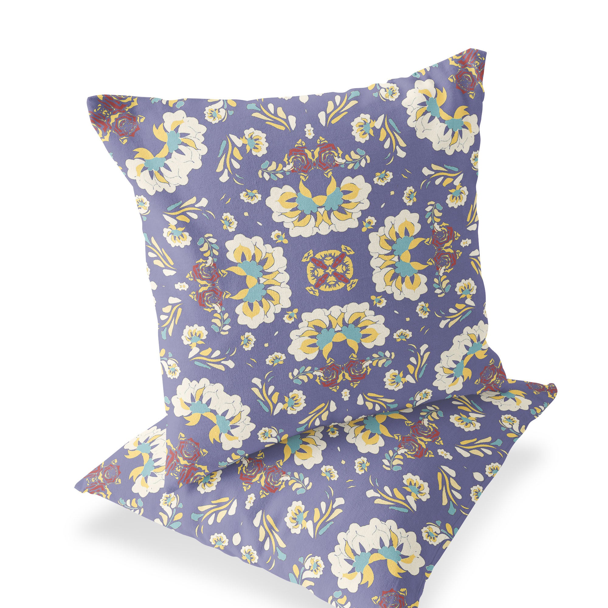 Set of Two 16" X 16" Purple and White Blown Seam Floral Indoor Outdoor Throw Pillow