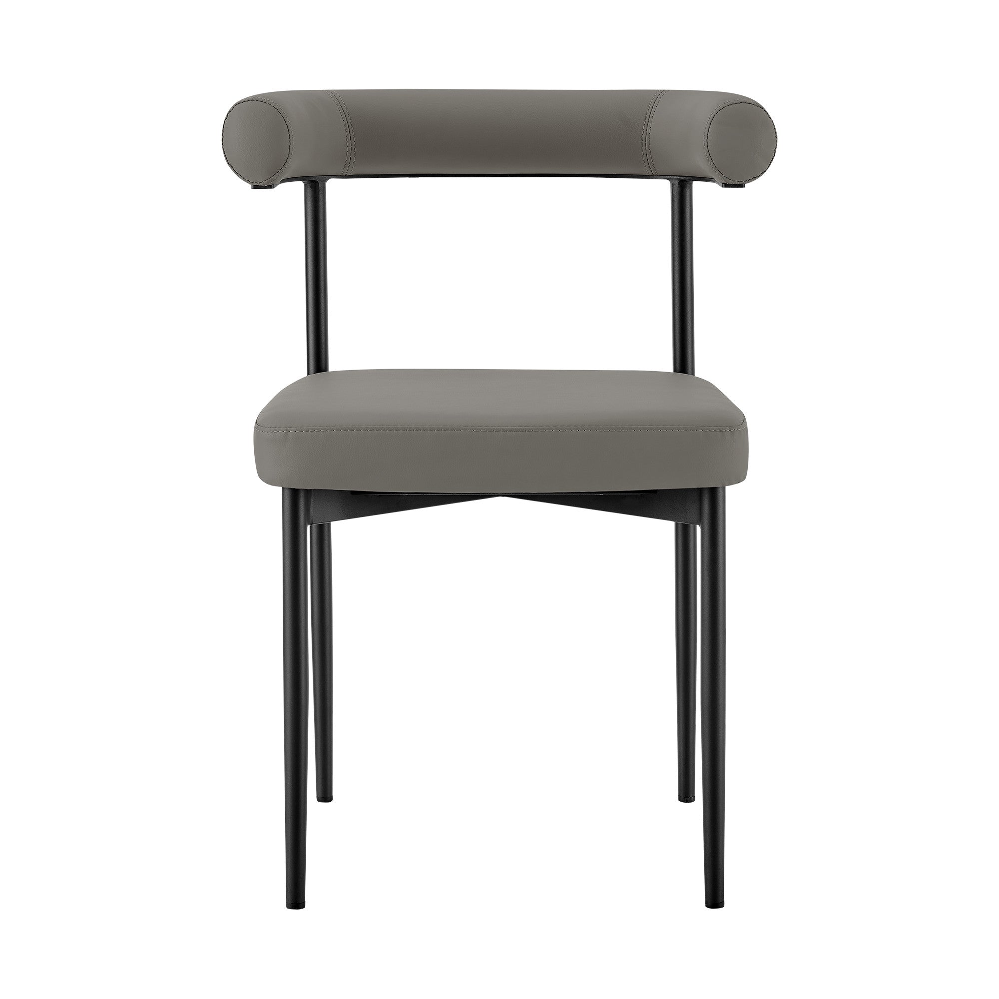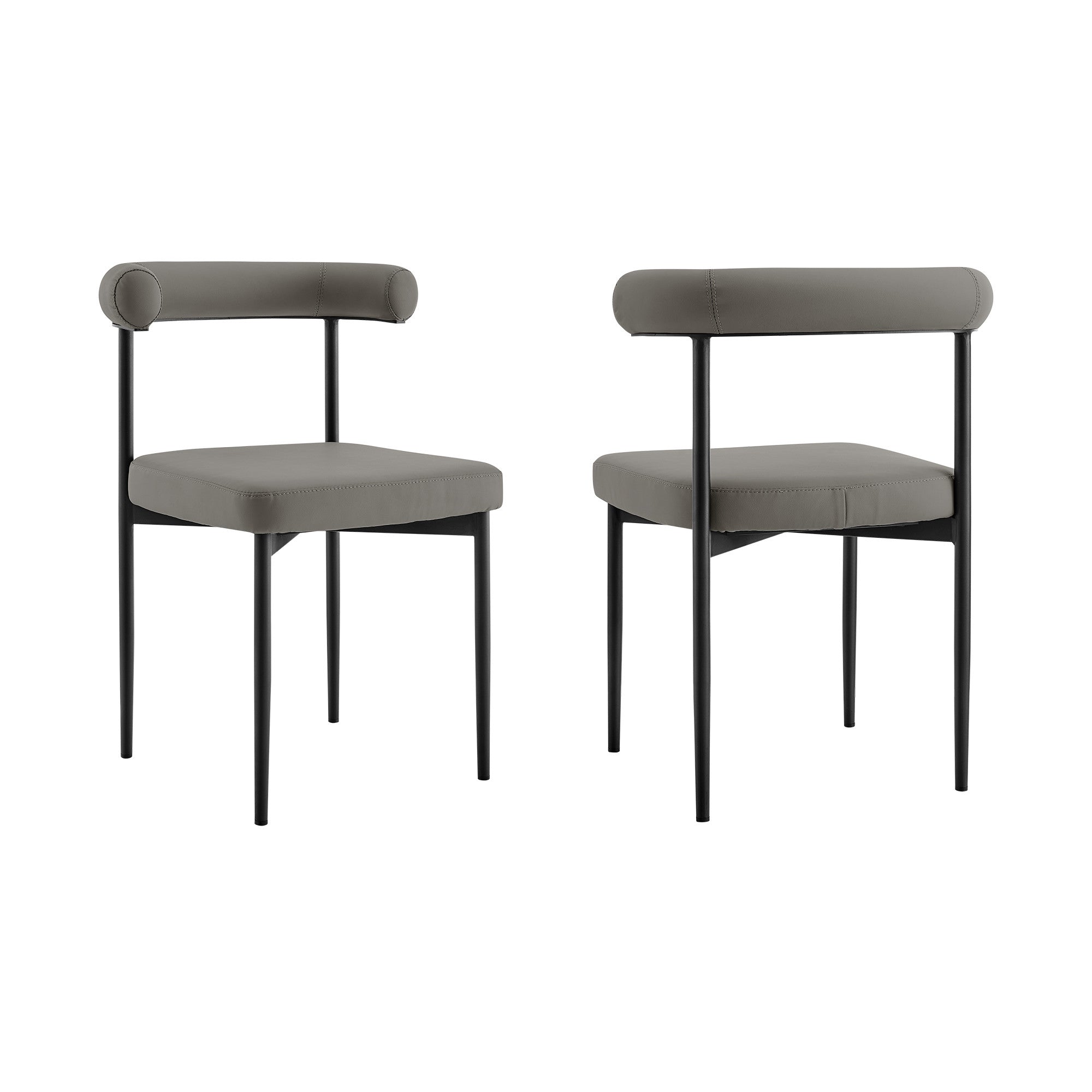 Out with the old and in with the new, this set of two gray and black upholstered faux leather open back dining side chairs can perfectly suit any dining table. The side chair has no arms so it can easily fit around the table. Can also be used as an accent in living room or bedroom. The open back gives this chair its unique style. Dining chairs are a great way to compliment your kitchen or dining room but can also be used in the foyer, hallway, or any room you might need extra seating. 30.5-inch H x 23.5-inch W x 20.5-inch D