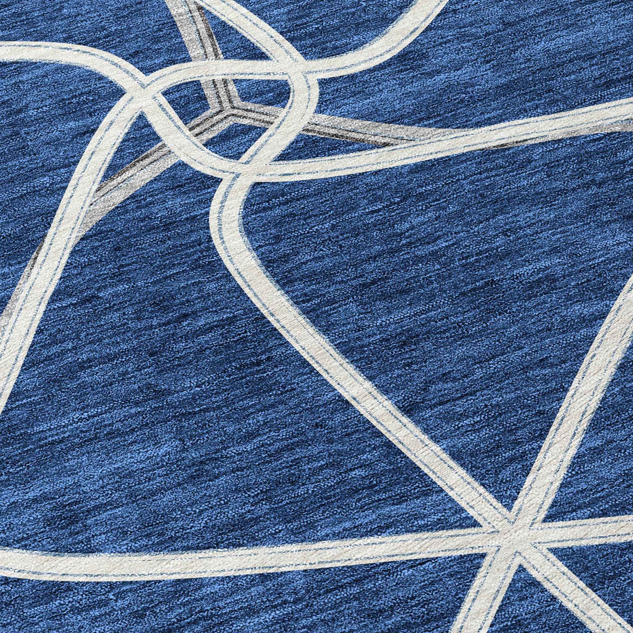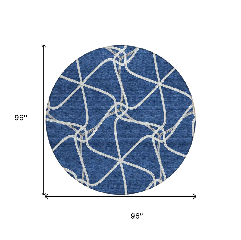 8' Blue And Ivory Round Geometric Washable Indoor Outdoor Area Rug