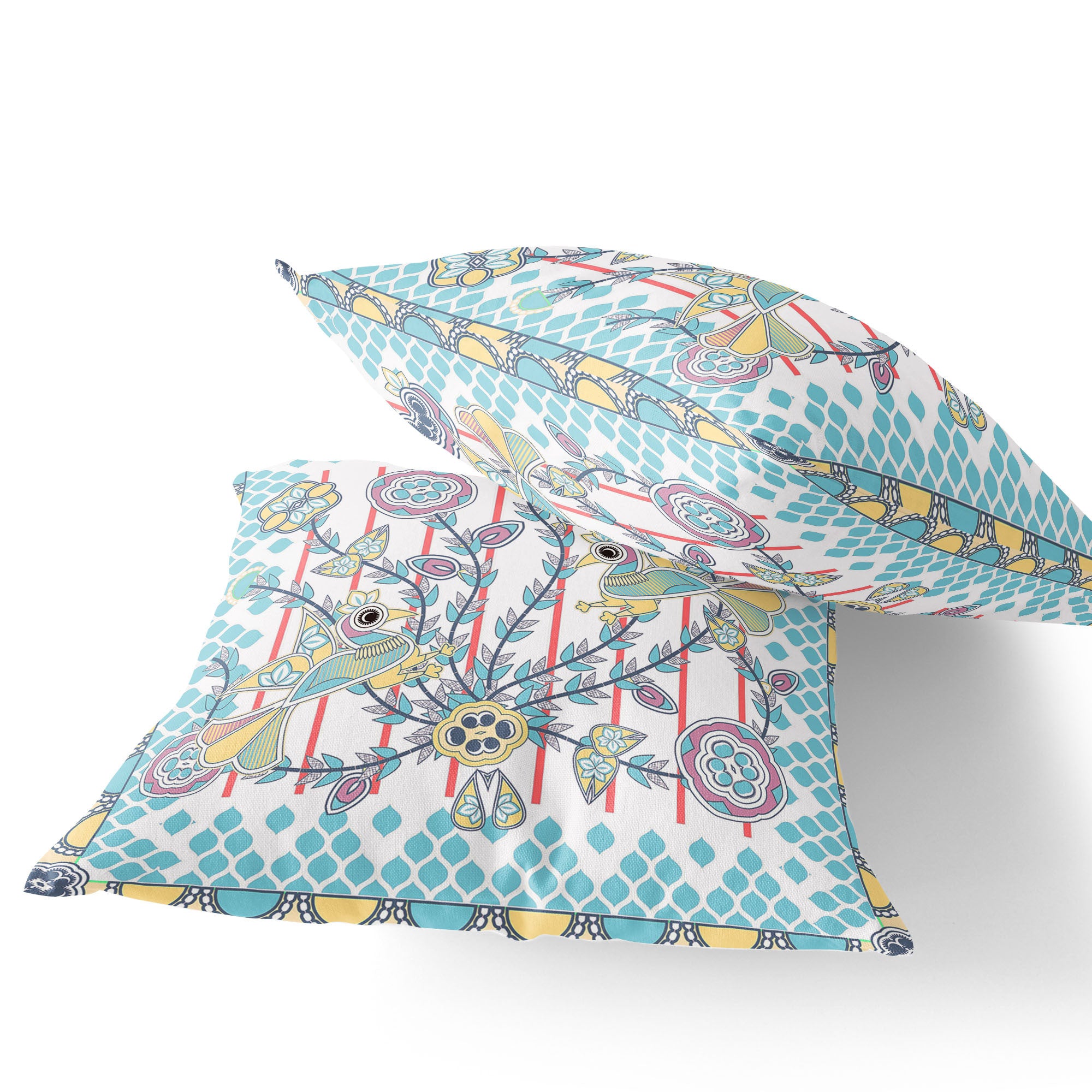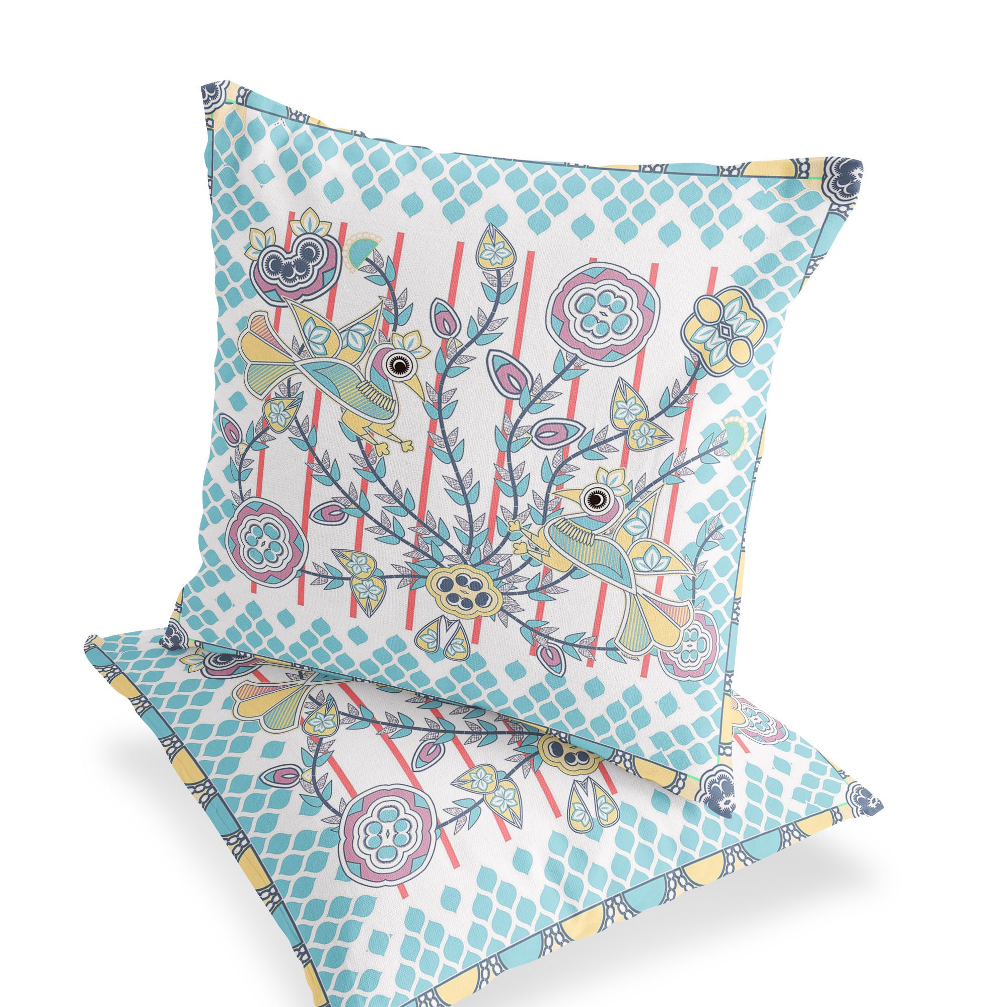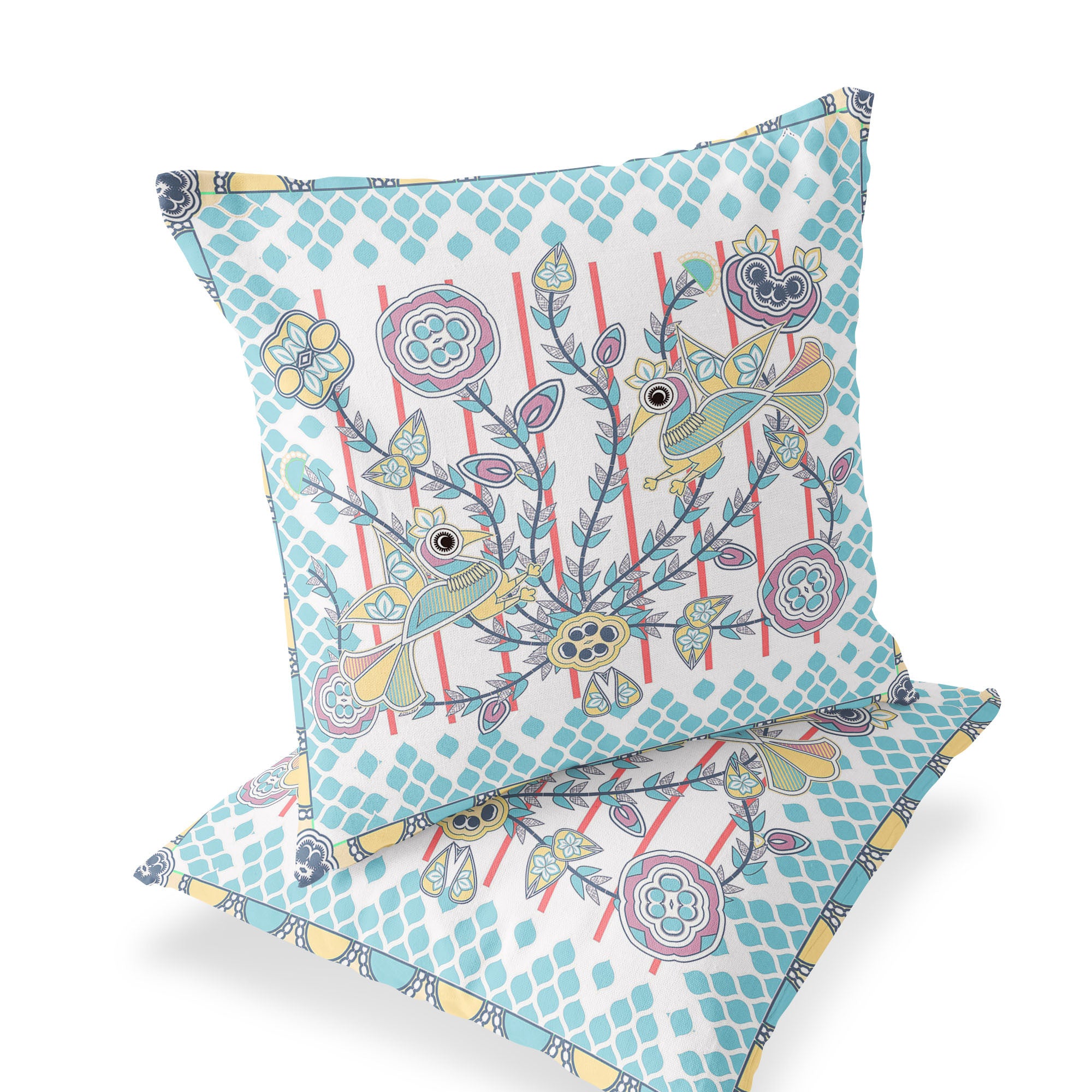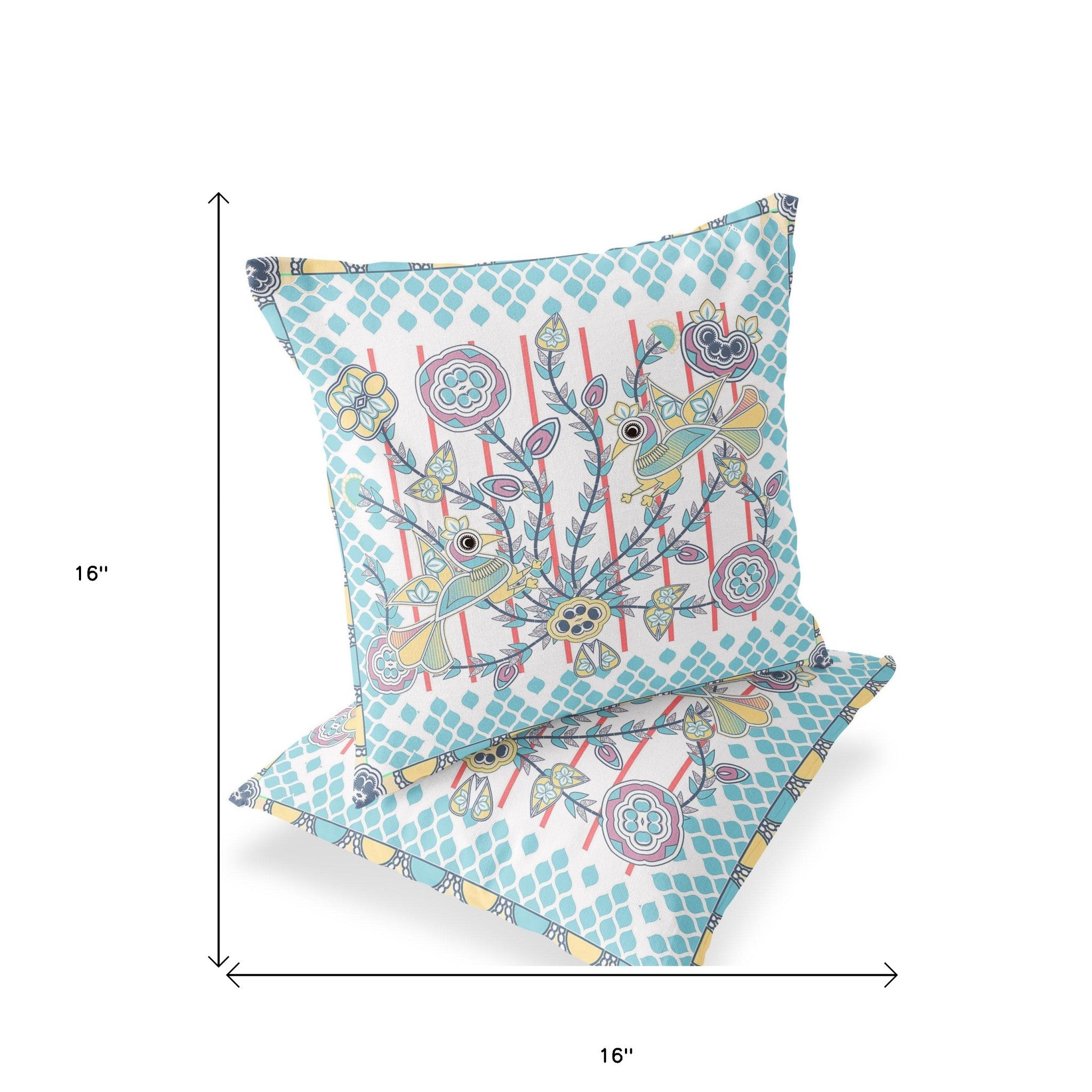 Set of Two 16" X 16" Blue and White Peacock Blown Seam Floral Indoor Outdoor Throw Pillow