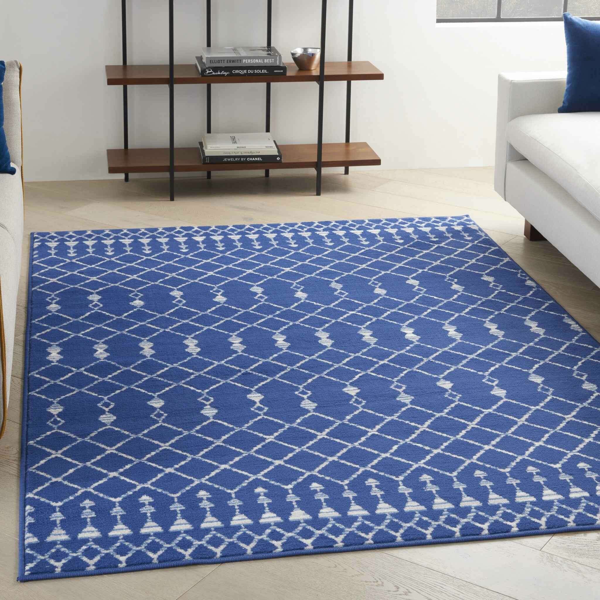Set an inviting tone in your space with this 5' x 7' navy blue geometric berber area rug. This rectangle shaped rug features a geometric design in navy blue to give it visual interest. A classic shape marries with good looking design for your space Place this area rug against a hardwood or tile floor and it will enliven your living space with style and sophistication. 1" H x 60" W x 84" D