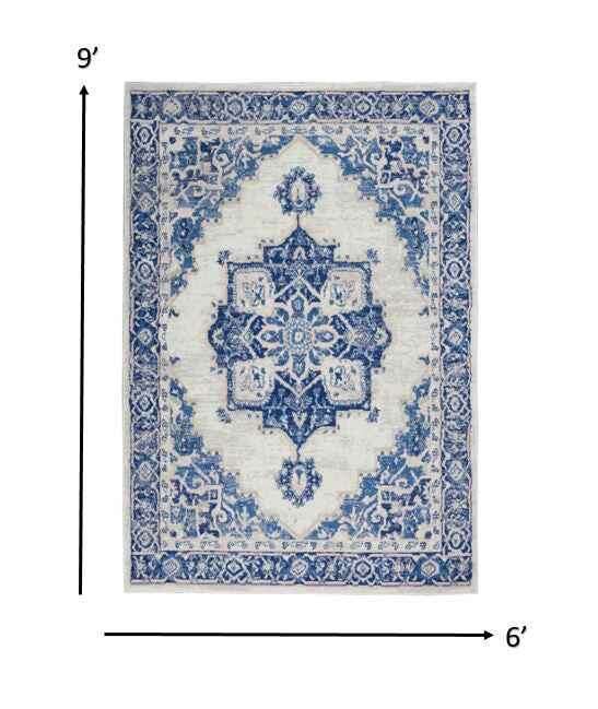 6' X 9' Blue And Ivory Floral Dhurrie Area Rug