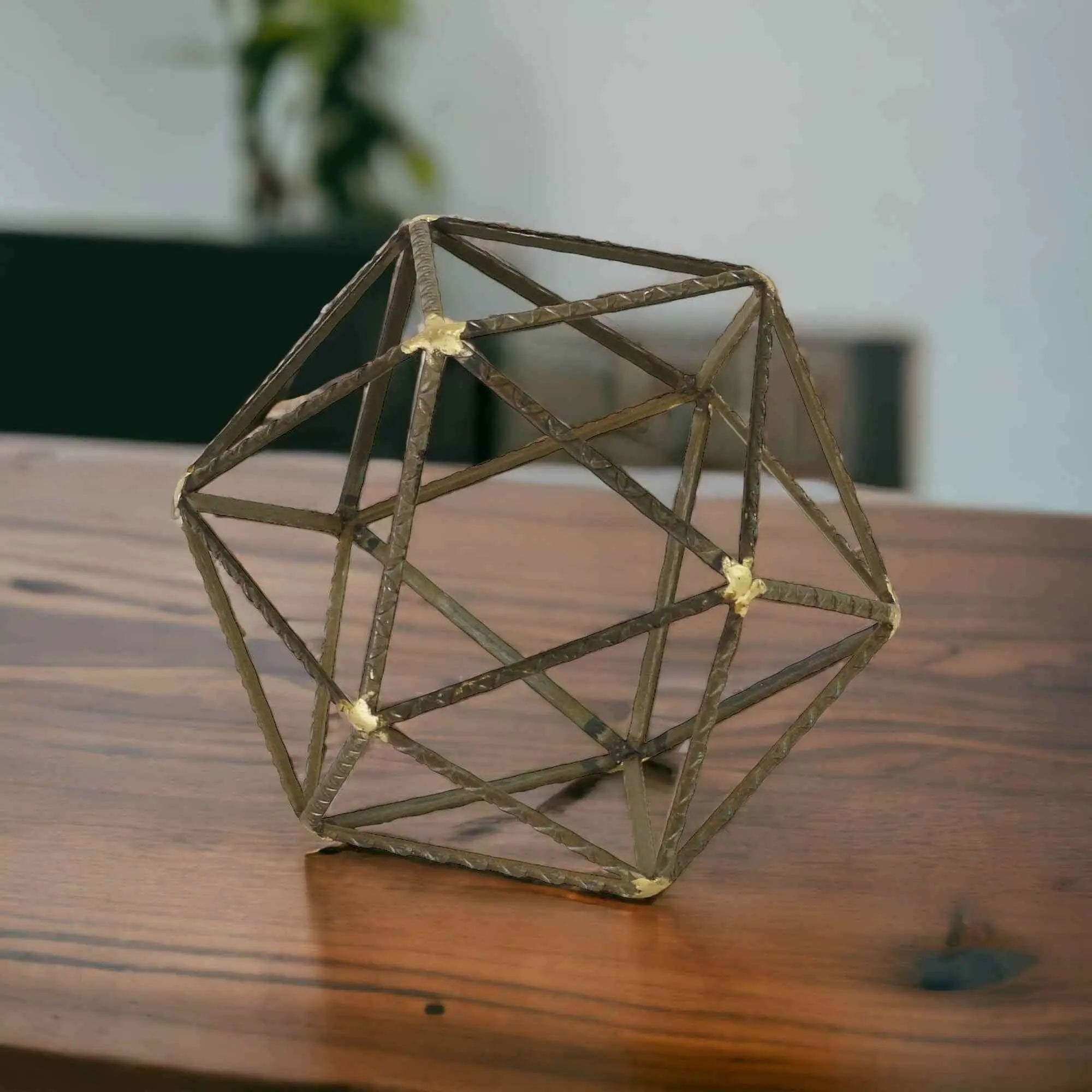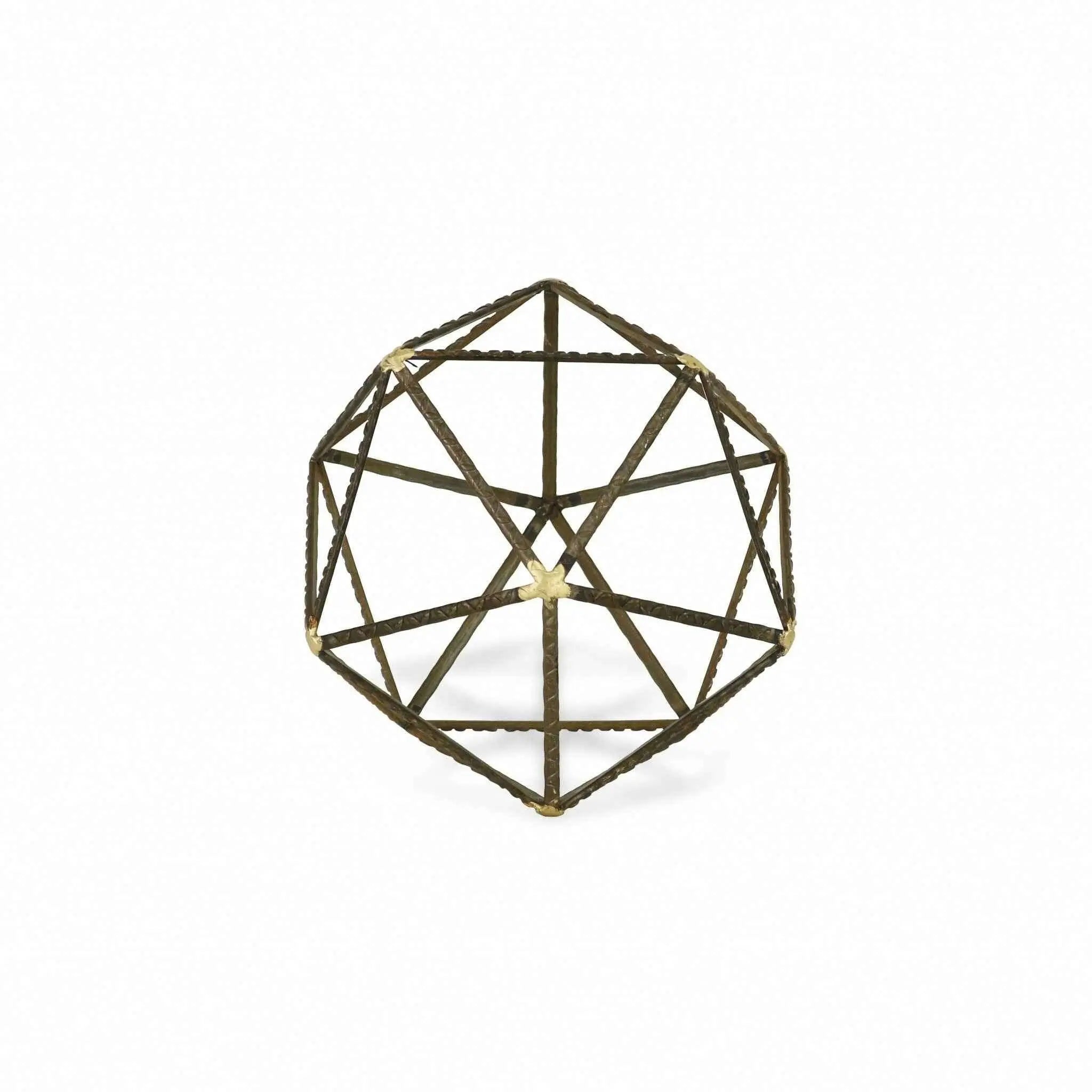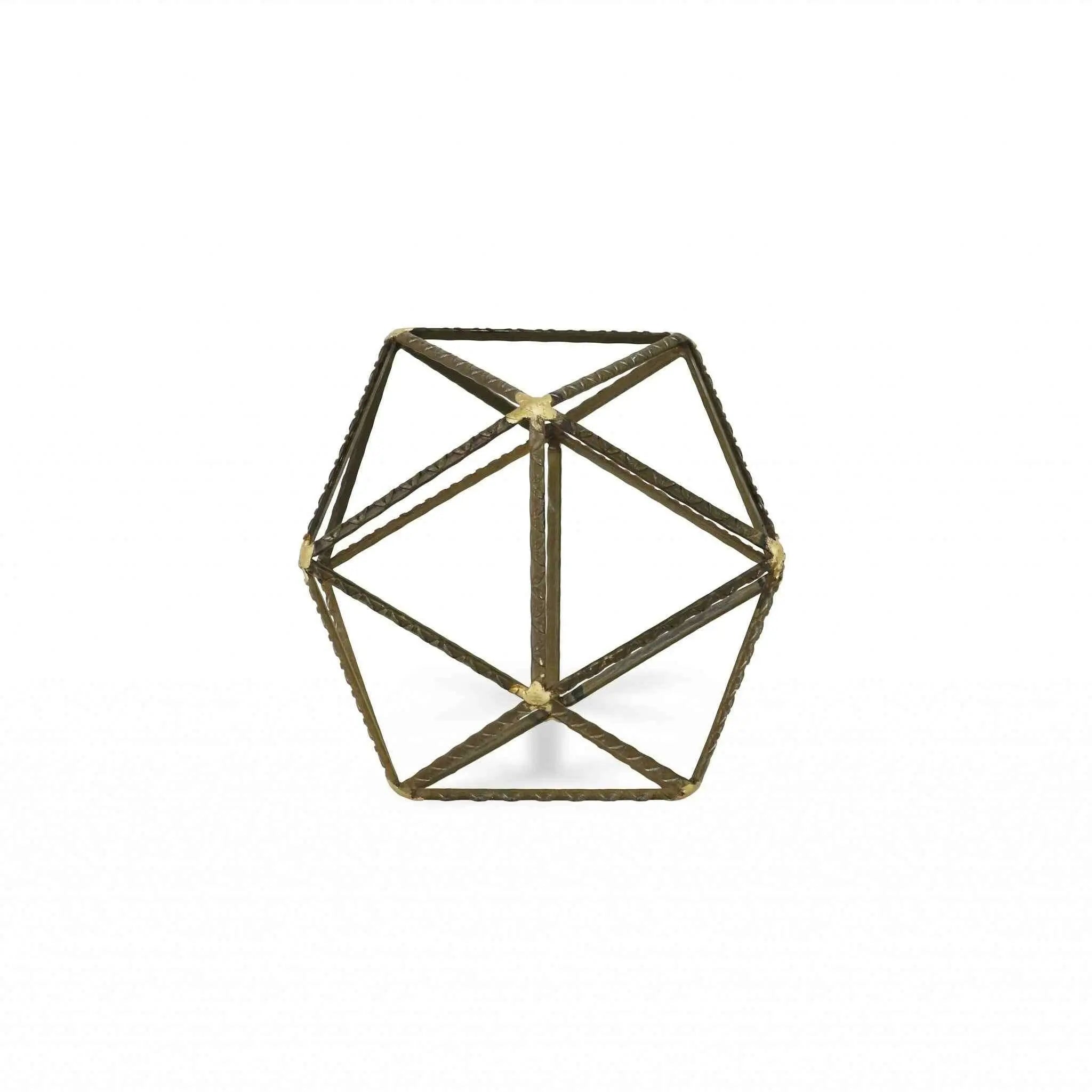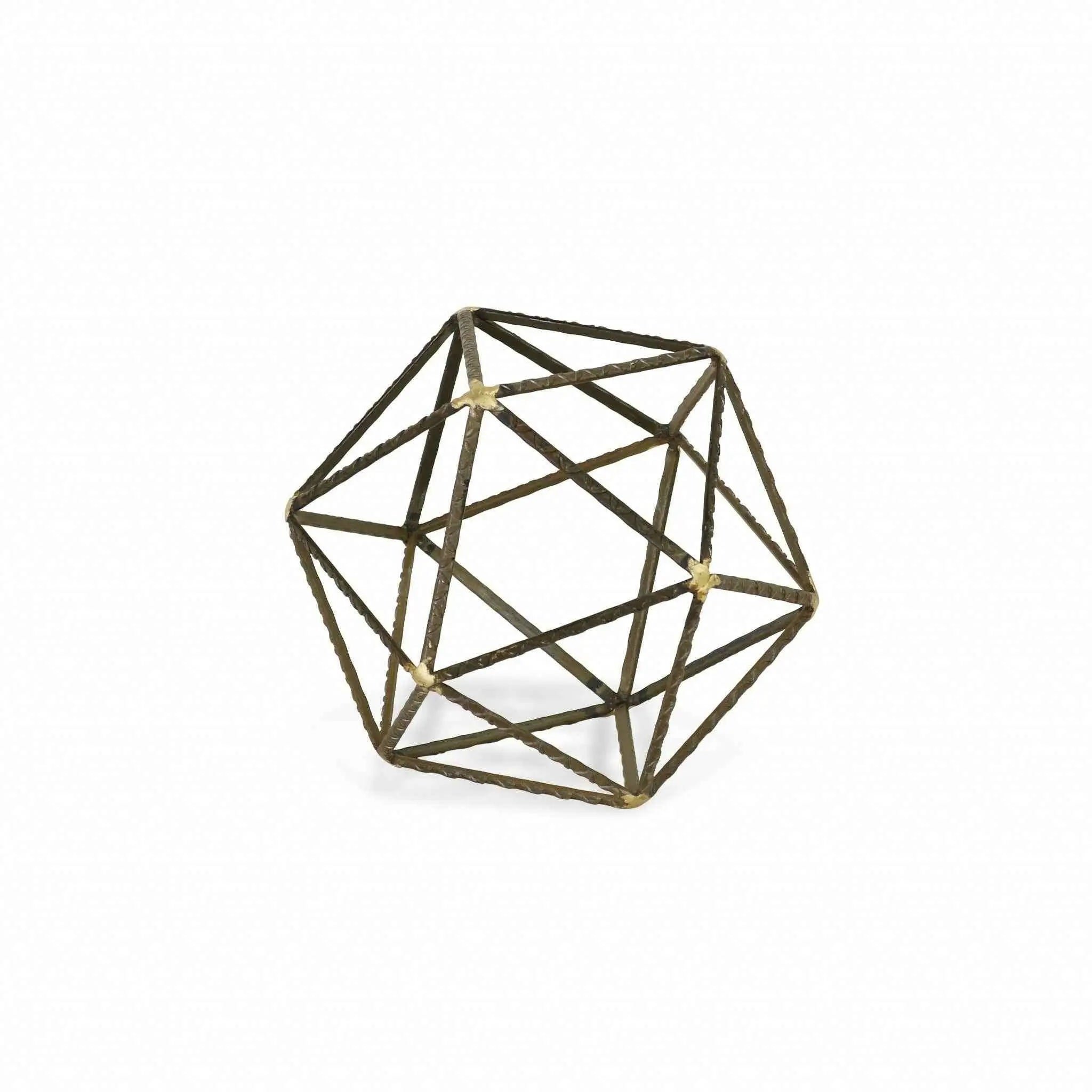 Unique and decorative, this 8-inch brown and gold metal hand painted geometric orb tabletop sculpture will leave a lasting impression. Add a touch of minimalist modern design to any space in your home with this open geometric decorative orb. This piece is made of metal in an industrial brown textural finish with gold painted stars at the joints. Use this piece as bookshelf decor, on your desk, coffee table, or anywhere in your home. 8-inch H x 8-inch W x 8-inch D