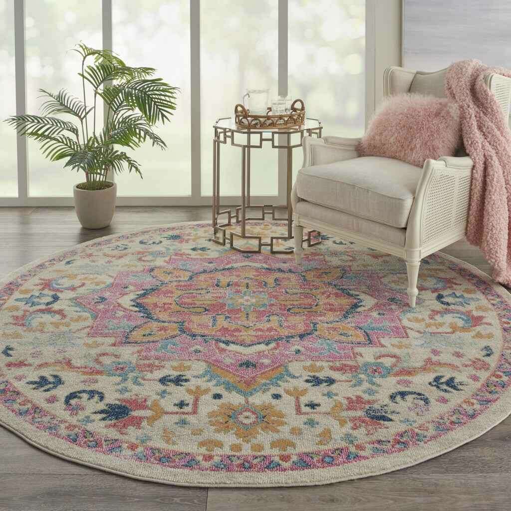 8' Pink And Ivory Round Southwestern Dhurrie Area Rug