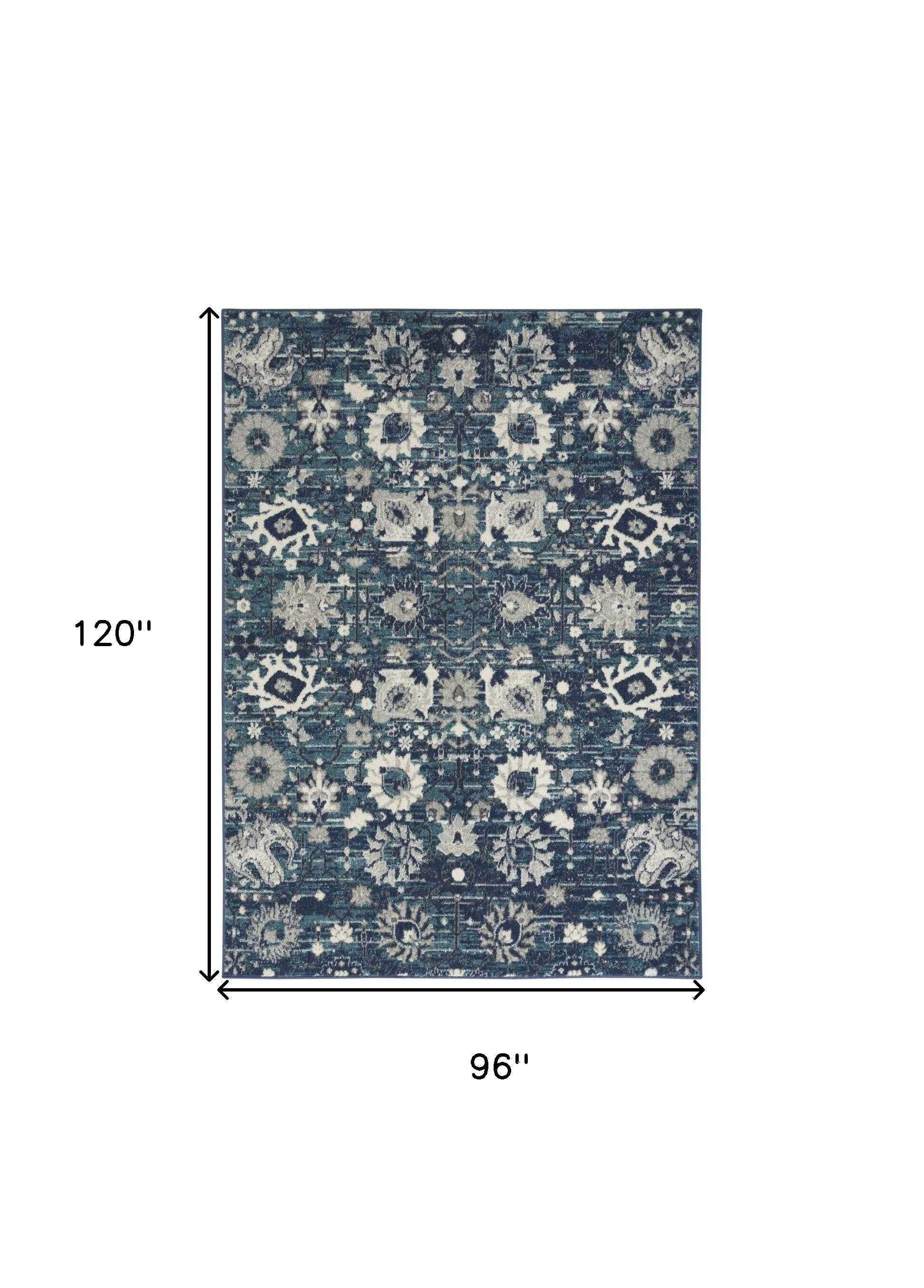 8' X 10' Navy Blue Floral Power Loom Distressed Area Rug