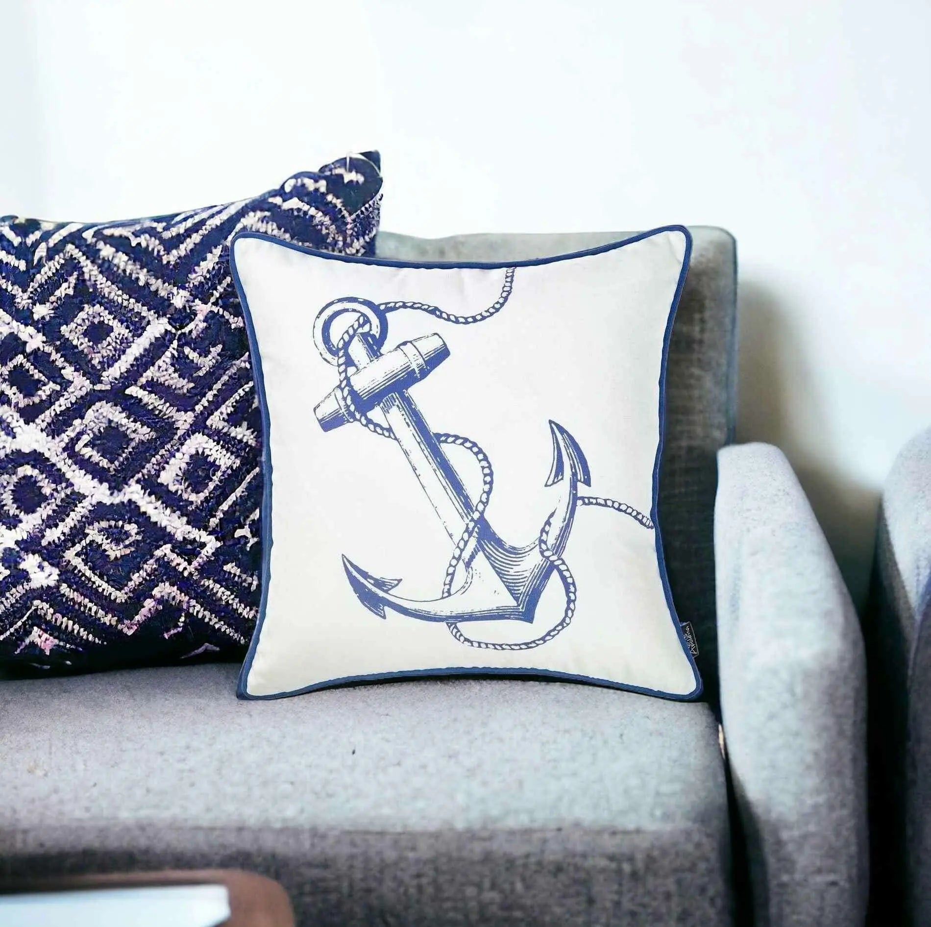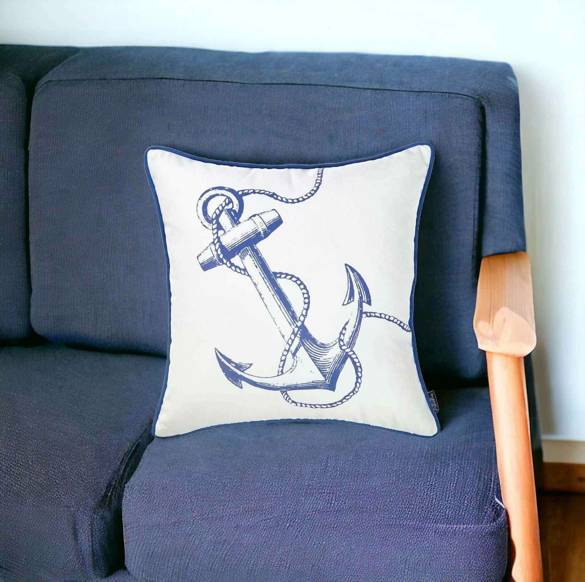 Flaunting a cool-toned color palette with a crisp marine motif, this Blue Bold Anchor Nautical Throw Pillow is sure to induce a sense of serenity to any modern or coastal living space. The detailed artwork of the blue anchor stands out over the pure white base creating visual interest while the blue piped edging completes the look with a seamless finish. Made in Turkey with 100% premium brushed polyester, which is OEKO-TEX Standard 100 certified to ensure durability, easy maintenance, and product safety. This decorative pillow sports a hidden zipper closure all around for a clean and smooth feel on the touch with a soft polyfill cotton insert for warmth and comfort. Place this decorative throw pillow on your bed, sofa, or couch and it will seamlessly blend in, giving off a nautical feel. 18” x 18” x 1”