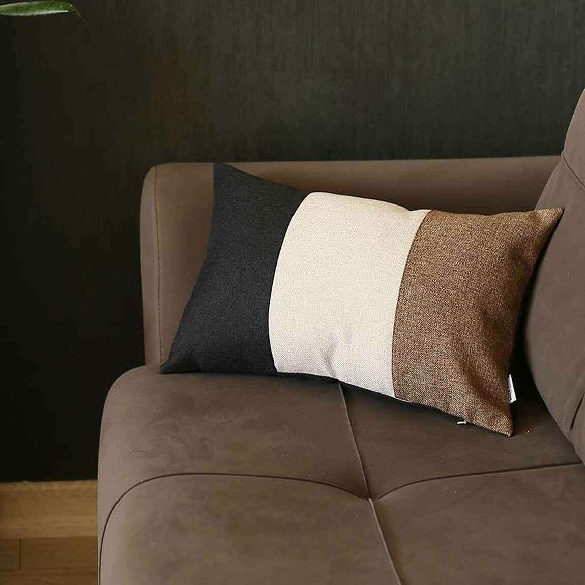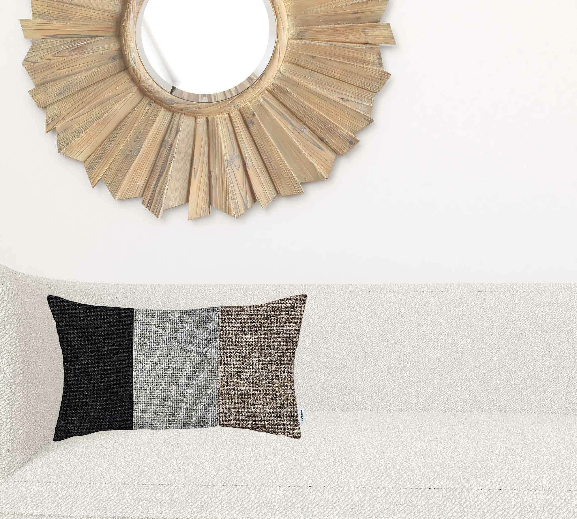 Enrich the aesthetics of your contemporary living space with this Brown Tripartite Lumbar Throw Pillow that exudes sophistication and class at its best. The elegant use of charcoal black, milky white, and earthy brown in a uniform striped design with a hidden zipper makes it feel harmonious and welcoming to the eyes. Ensuring high-quality craftsmanship by Turkish artisans, this pillow is created with 100% polyester fabric that is OEKO-TEX Standard 100 certified to ensure product safety, enhanced durability, and color intensity while cleaning spots is a no brainer. The soft poly filling insert contributes to the fluffiness for a luxurious look and comfort. The contrasting tricolor design of this decorative lumbar pillow complements bold and neutral shades brilliantly to help your living space feel lively and inviting. 12” x 20” x 1”
