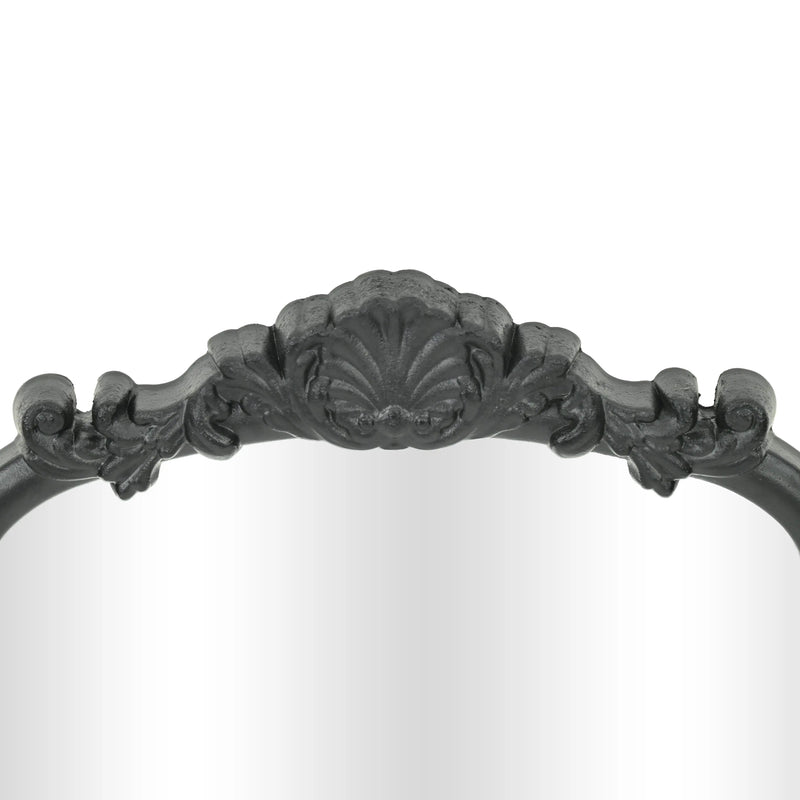 This stylish 12-inch black solid wood scalloped freestanding framed makeup shaving tabletop mirror is the perfect solution for all your styling and makeup needs. Framed with solid wood with a pretty floral scalloped design. This mirror will bring practical application and fashionable design to your space. Produced with premium quality glass for a beautiful reflection, this mirror will provide an exceptional visual experience and be a great getting ready addition for your bedroom, bathroom, vanity, counter, or desk. 11.75-inch h x 8.25-inch w x 0.75-inch d.