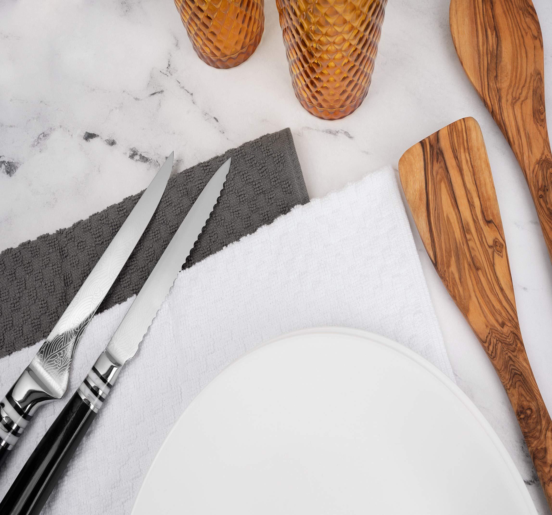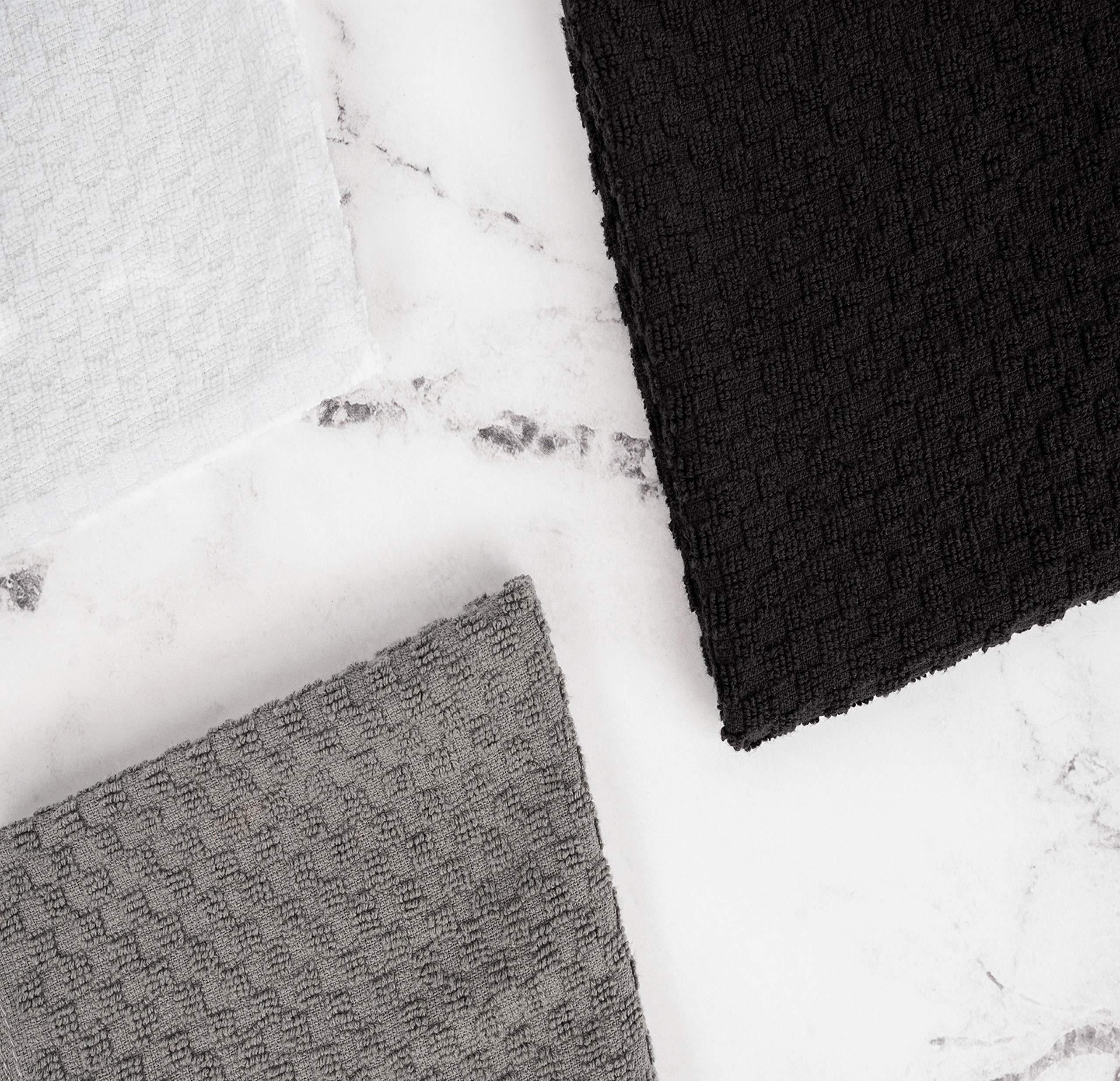 UNMATCHED QUALITY: Our black and white dish towels are designed with outstanding craftsmanship and made from premium dobby weave 100% cotton ensuring they withstand years of frequent use and washing without losing their plush feel and absorbency EXCEPTIONAL LIQUID ABSORPTION: Featuring superior absorbency, these cotton kitchen hand towels splendidly soak up liquids, making them the ideal choice for quick clean-ups, drying dishes, and tackling spills with unparalleled efficiency OPTIMIZED KITCHEN SIZE: Measuring 15 x 26 inches, our dish towels for drying dishes offer the ideal balance between size and functionality, making them versatile enough for drying, cleaning, and cooking tasks alike TIMELESS CLASSIC: Boasting a timeless aesthetic appeal, these dish drying towels are crafted to complement any kitchen decor, enhancing the overall look of your cooking space while offering functionality CARE INSTRUCTIONS: Cotton dish towels for kitchen drying are machine washable and safe to dry. It is recommended to wash them before the first use. Do not use bleach or fabric softeners. Tumble dry on low, and for best results, dry immediately. Do not iron
