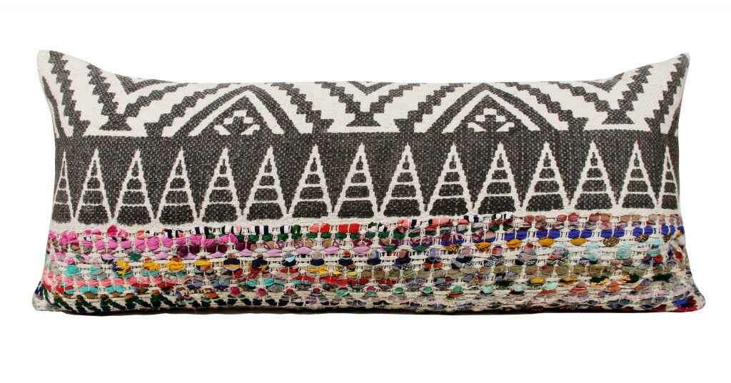 The perfect complement to your sofa, favorite chair, or bed, this 14" x 36" off-white black red blue orange and green 100% cotton geometric zippered pillow is a great decorative accent. Soft and textural off-white black red blue orange and green 100% cotton has been used to make this pillow look and feel like a real treasure. Great to use on its own or mix with other decorations for the perfect look. A great decorative accessory for your favorite chair, to accent your sofa, or to use as part of your bed ensemble. 14" H x 14" W x 36" D