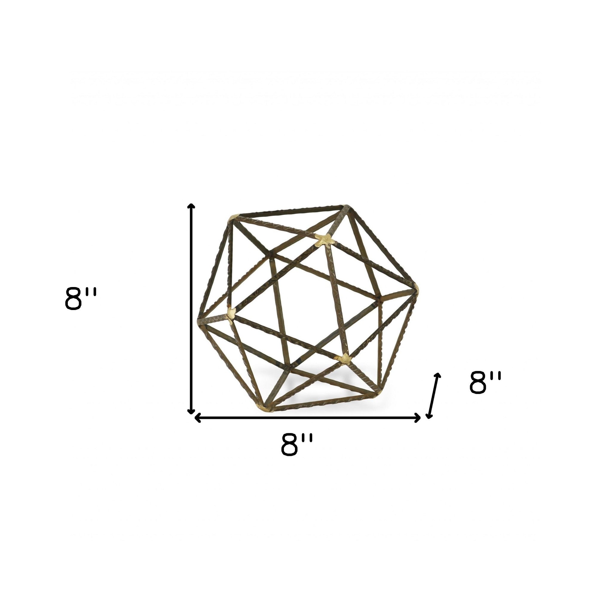 Unique and decorative, this 8-inch brown and gold metal hand painted geometric orb tabletop sculpture will leave a lasting impression. Add a touch of minimalist modern design to any space in your home with this open geometric decorative orb. This piece is made of metal in an industrial brown textural finish with gold painted stars at the joints. Use this piece as bookshelf decor, on your desk, coffee table, or anywhere in your home. 8-inch H x 8-inch W x 8-inch D