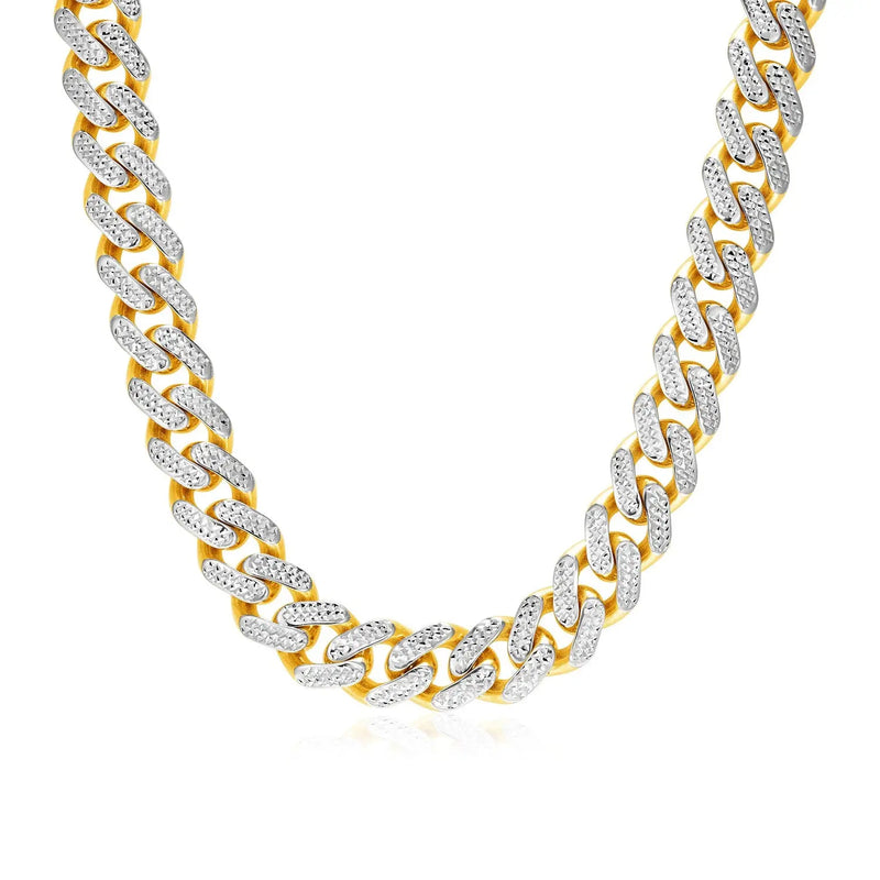 The shine of white gold pave punctuates the timeless elegance of this beautiful 14k two-toned gold necklace. Necklace is 24 inches long, 13.5mm wide, and closes with a box clasp.