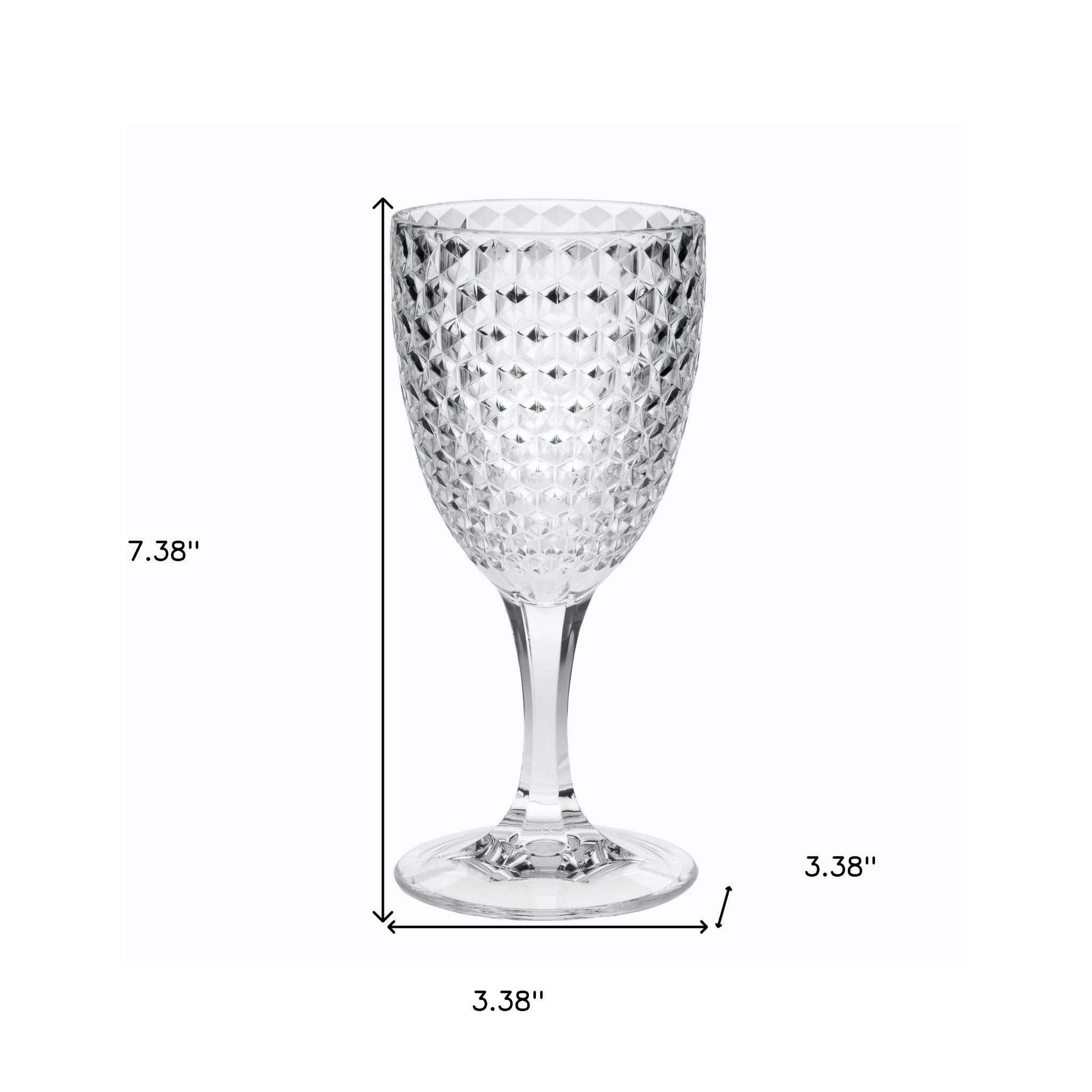 From first sip to last drop, you are certain to savor the taste of your favorite vino with the set of four clear diamond acrylic stemmed all purpose wine glass. Whether you are entertaining or simply enjoying a drink by yourself, a quality set of stemware is a must-have. From wine to cocktails, the versatility of stemmed glassware adds a touch of refinement to any drink. The addition of a machine embossed design gives this glass special character and dimension. Bring a pop of personality to your kitchen or dining room with this diamond pattern. The texture on this surface not only looks great but feels cool in your hand. Whatever your beverage preference, you are certain to enjoy the enhanced flavor and taste that comes with consuming from the proper vessel. 7.38-inch H x 3.38-inch W x 3.38-inch D