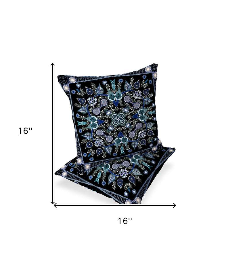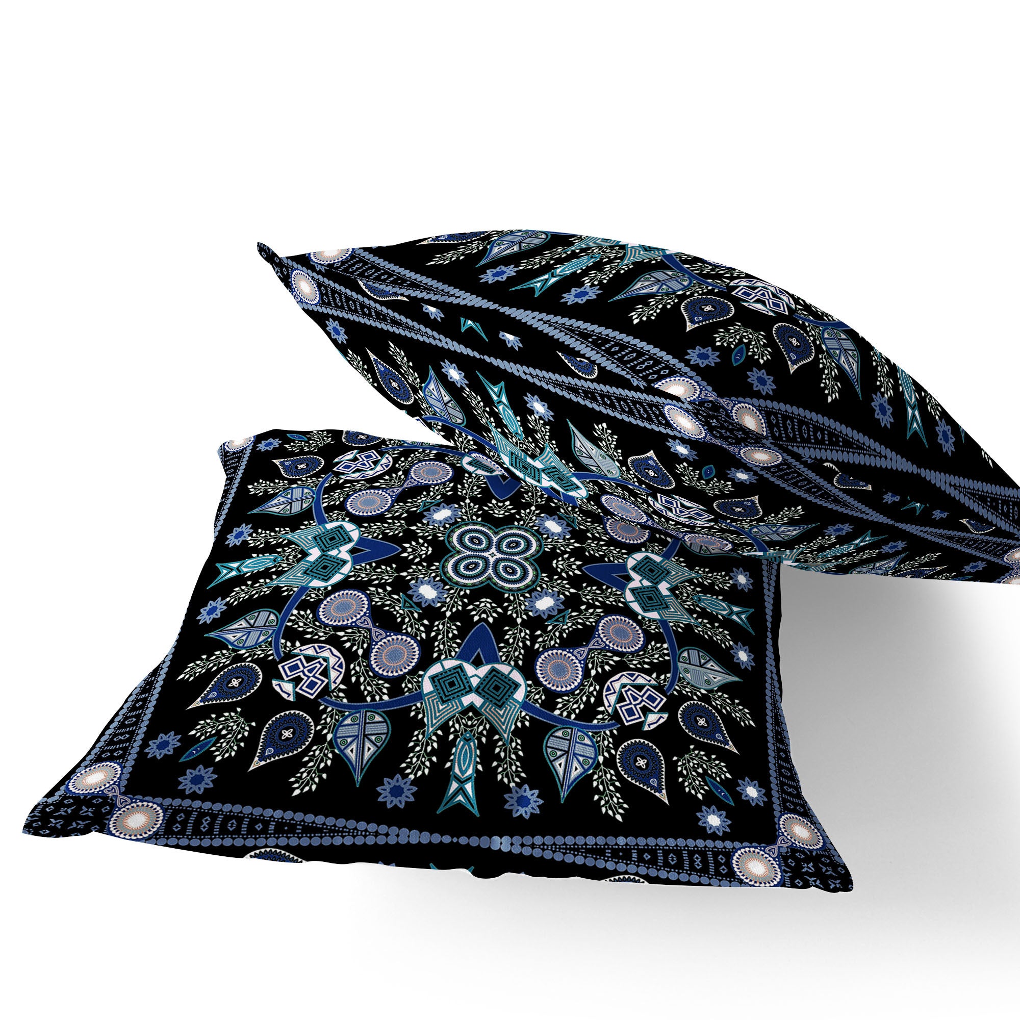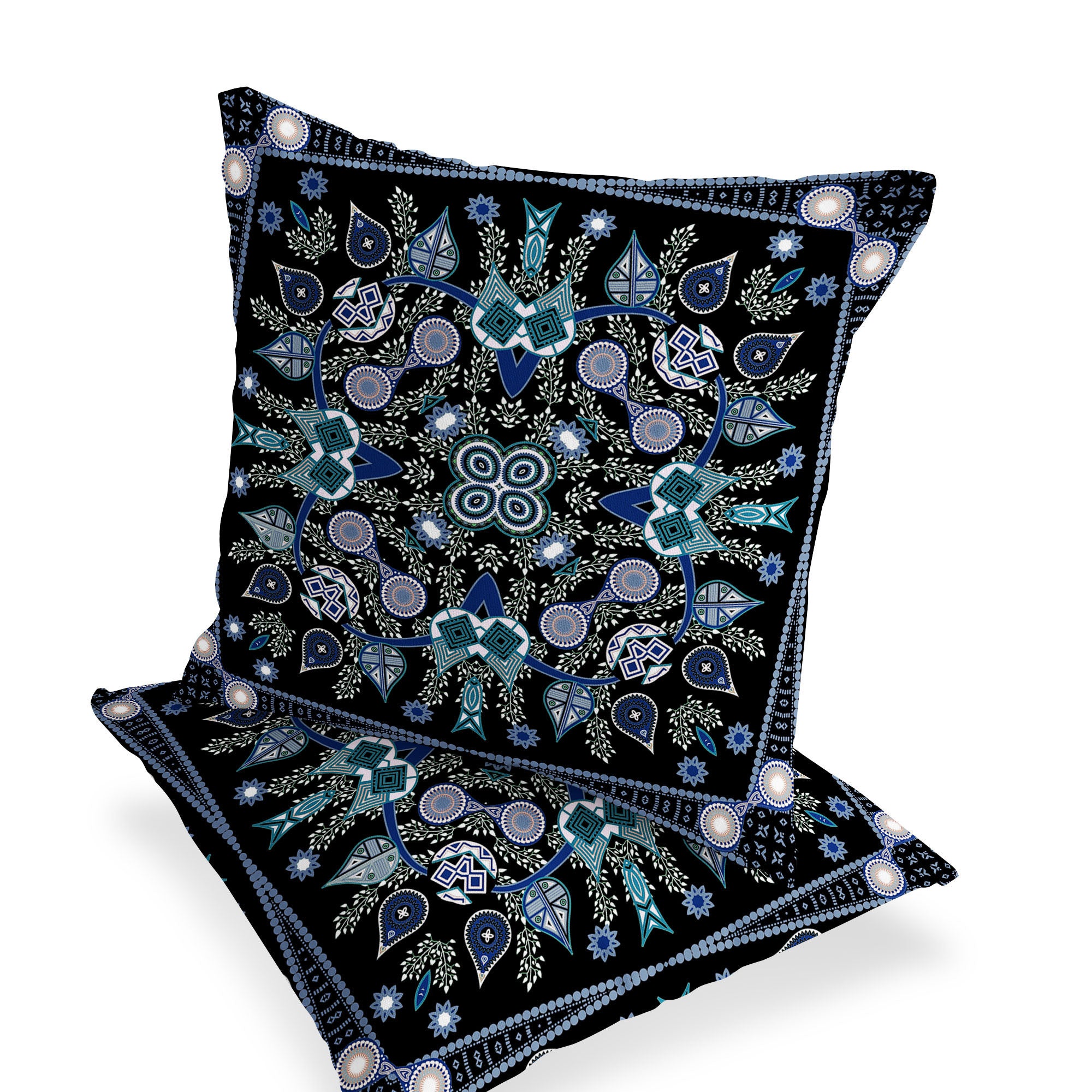 Set of Two 16" X 16" Black and Blue Blown Seam Paisley Indoor Outdoor Throw Pillow