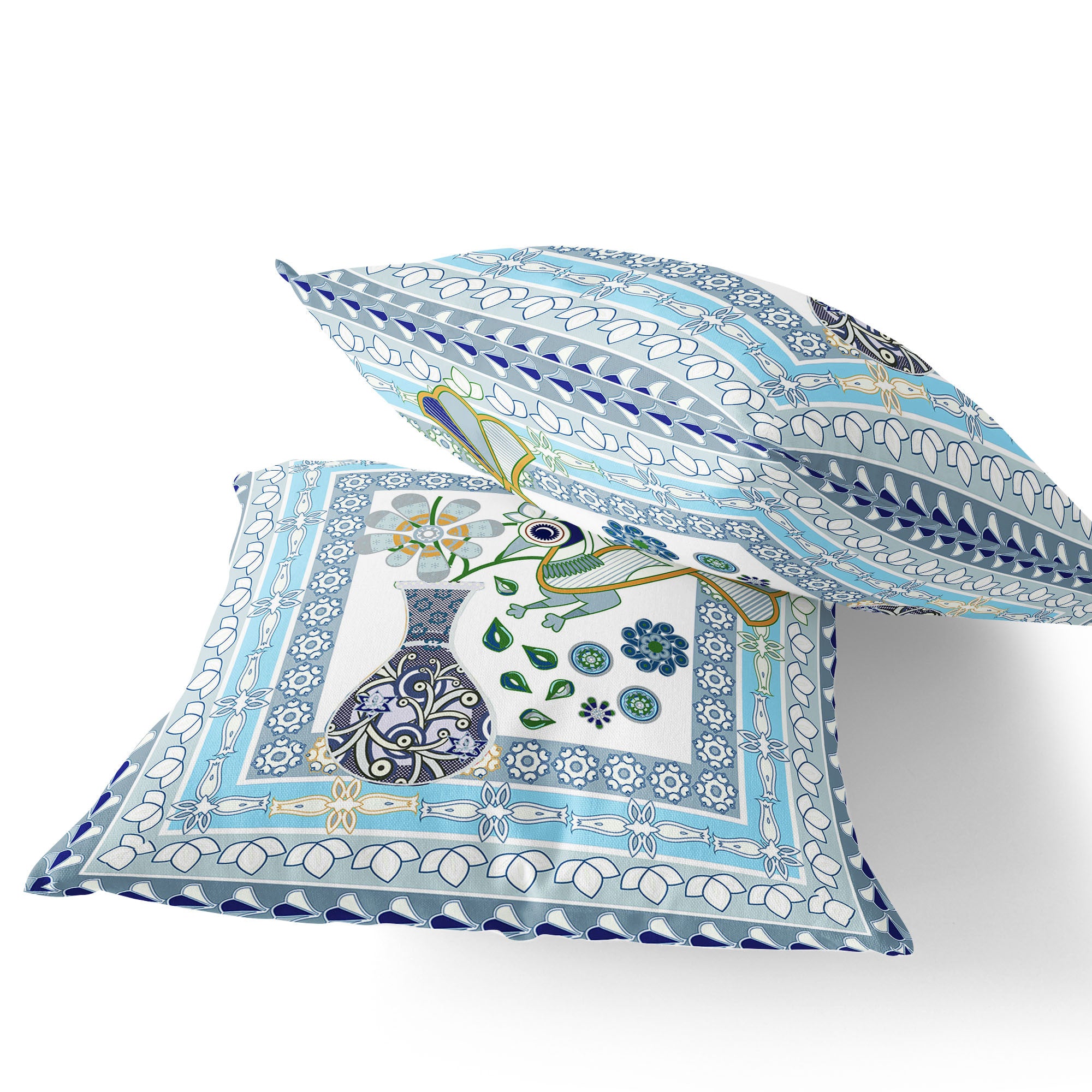 The set of two 16-inch x 16-inch gray and white peacock blown seam floral indoor outdoor throw pillow is the perfect decorative accessory for your home. The gray and white coloring of the extremely durable and long lasting polyester pillows will add dimension and texture to your space. Will add some color and dimension to your space indoors or out. A great decorative accessory for your favorite chair or to accent your sofa. 16-inch H x 16-inch W x 5-inch D