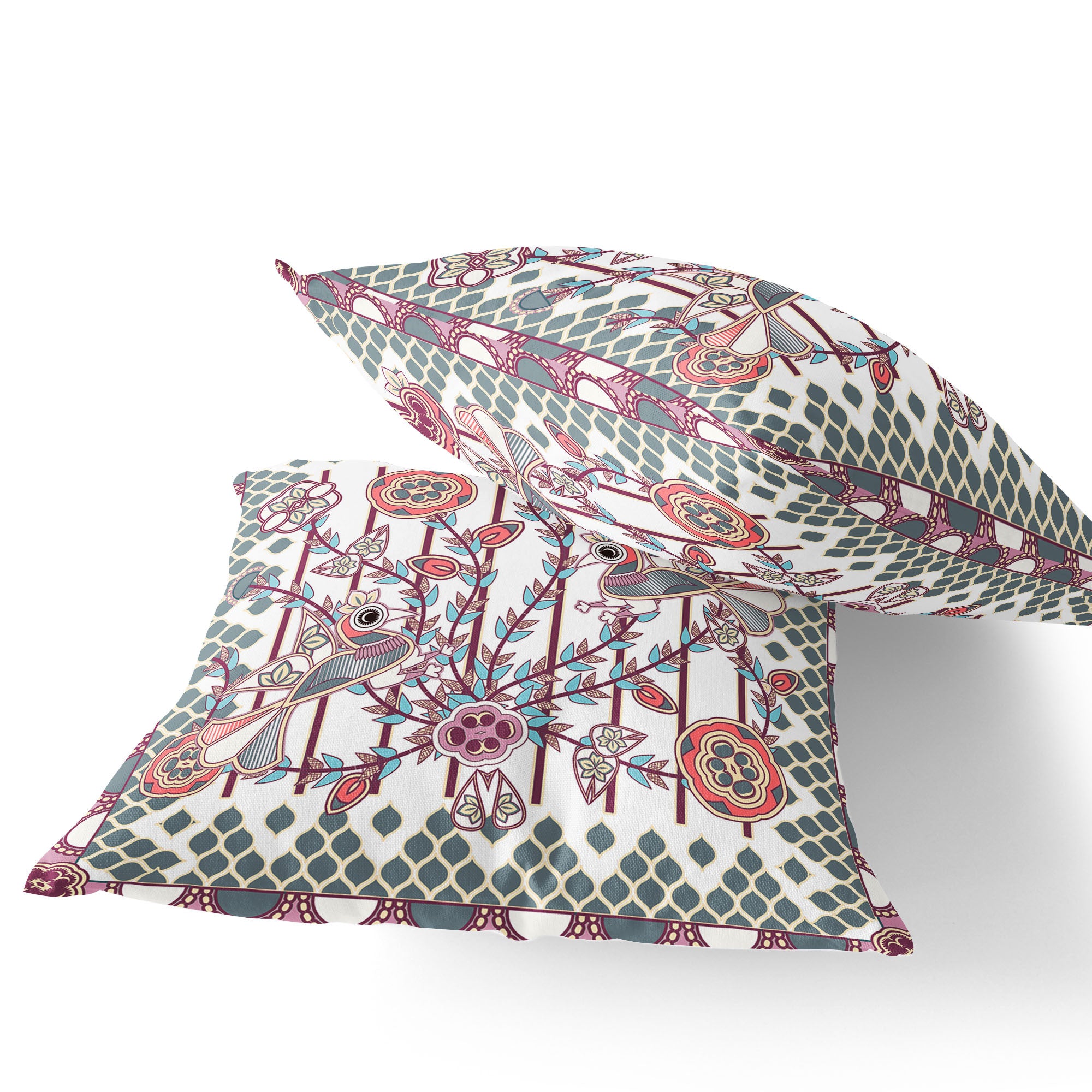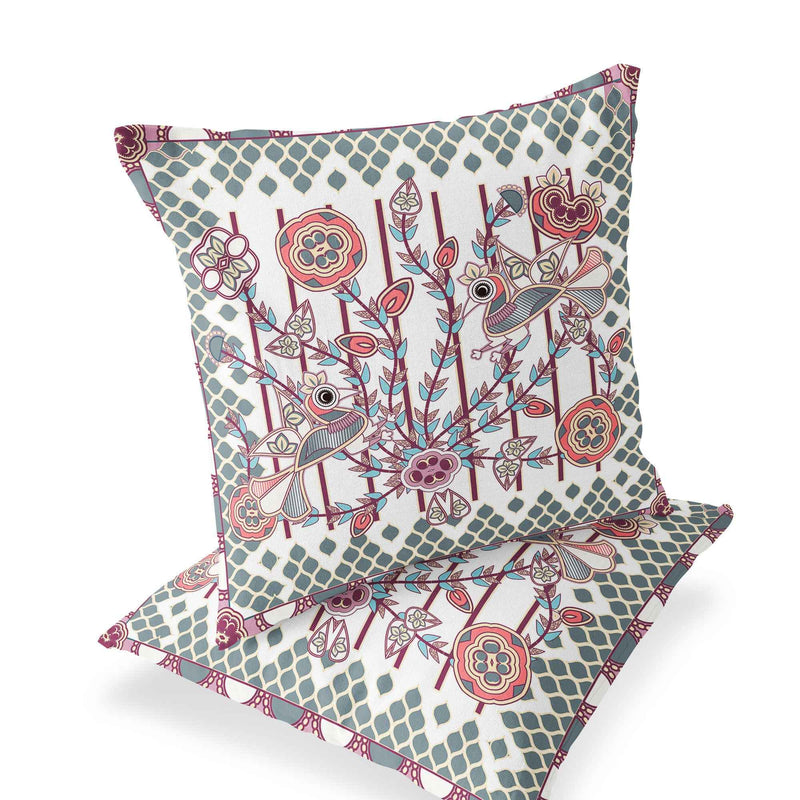 Set of Two 16" X 16" Red and White Peacock Blown Seam Floral Indoor Outdoor Throw Pillow