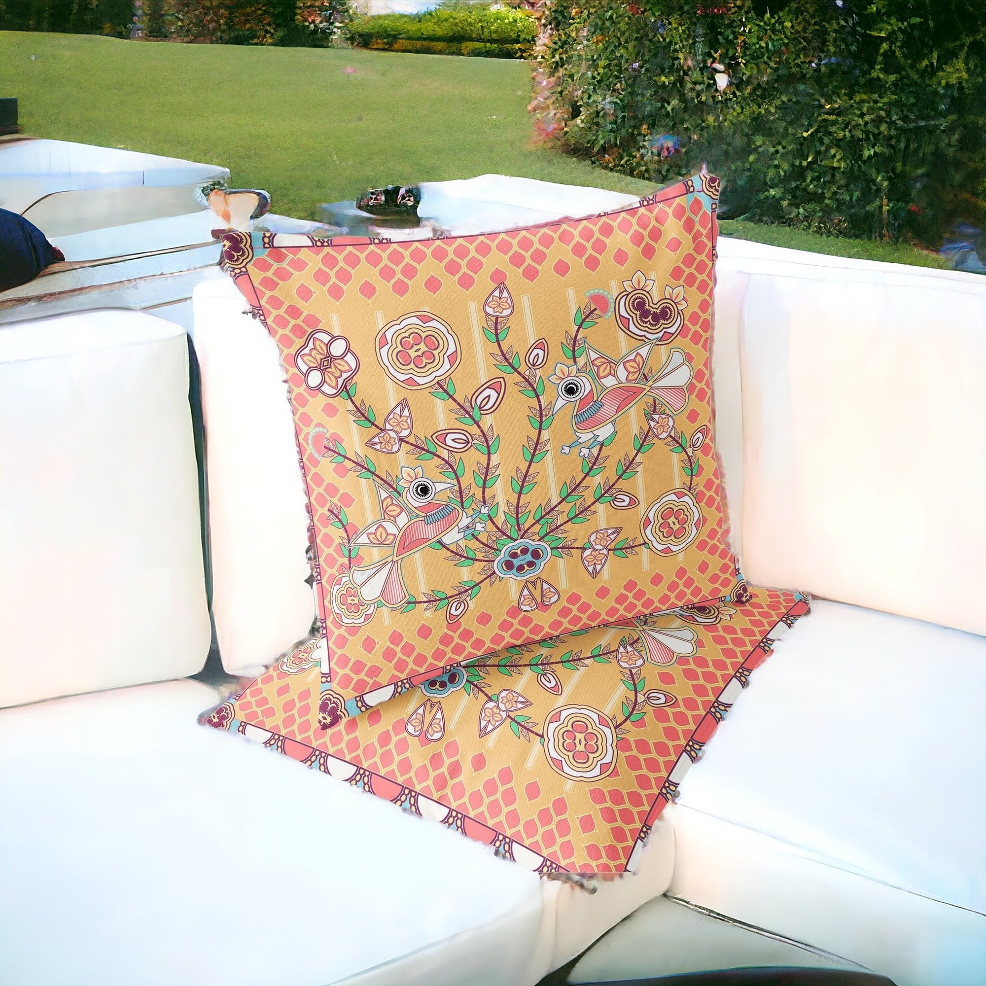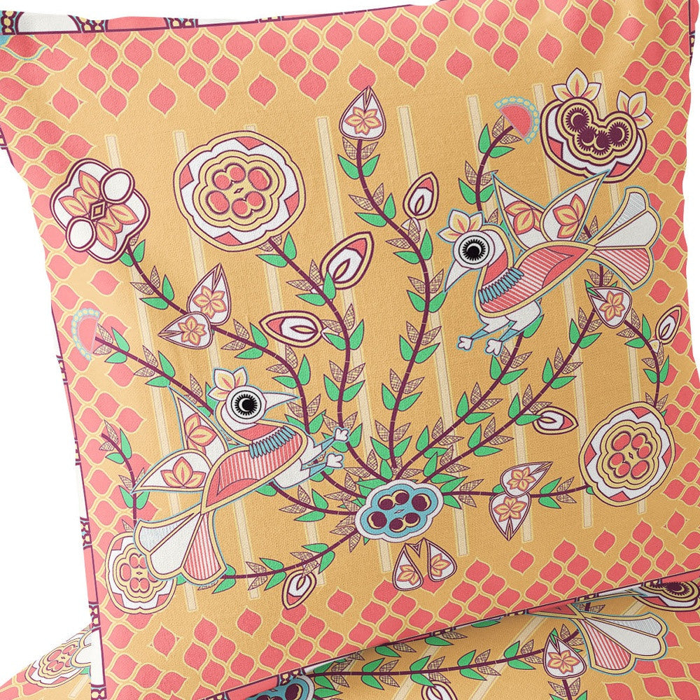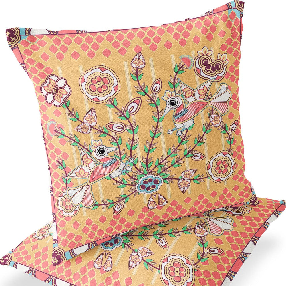 Set of Two 16" X 16" Yellow and Peach Peacock Blown Seam Floral Indoor Outdoor Throw Pillow
