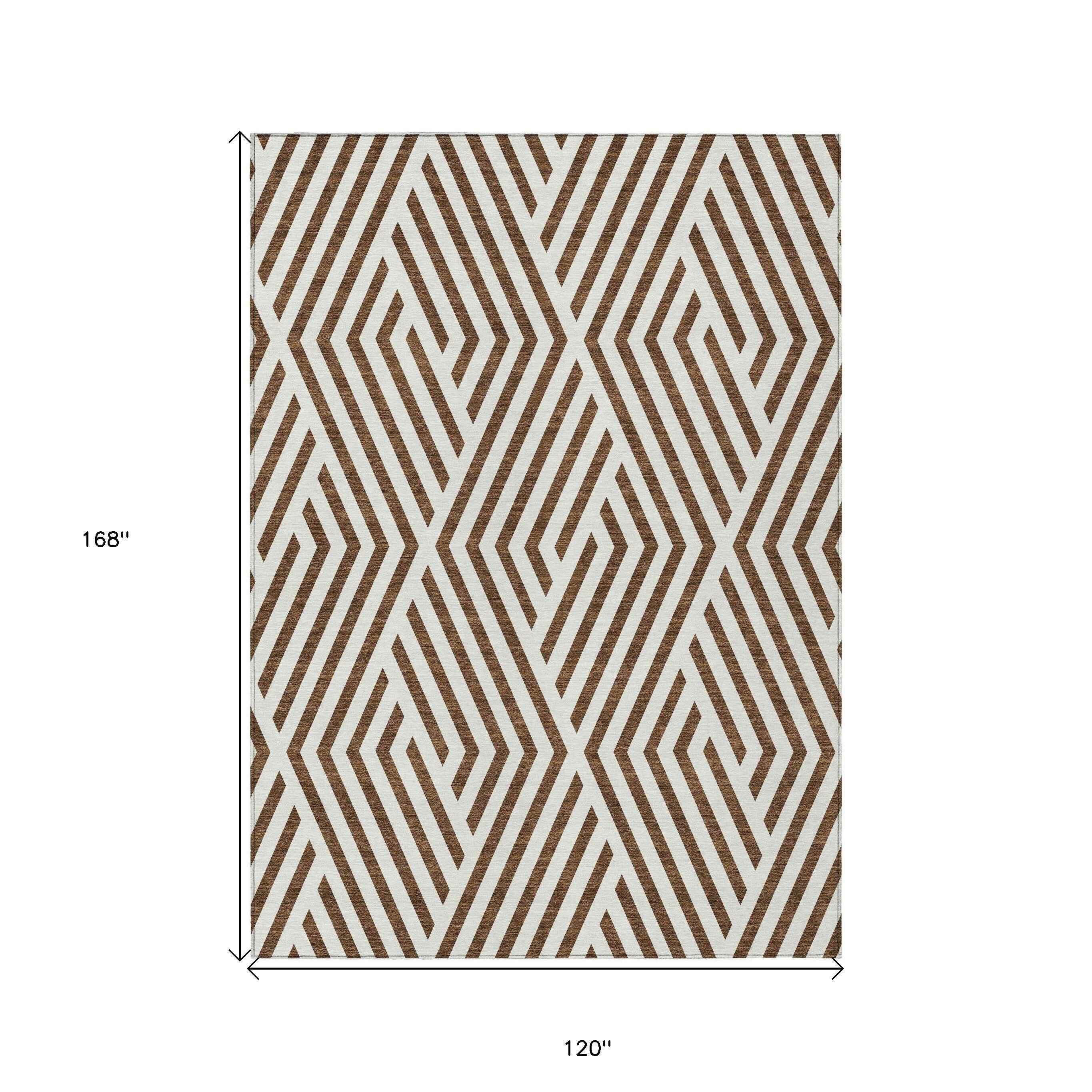 10' X 14' Brown and White Geometric Washable Non Skid Indoor Outdoor Area Rug