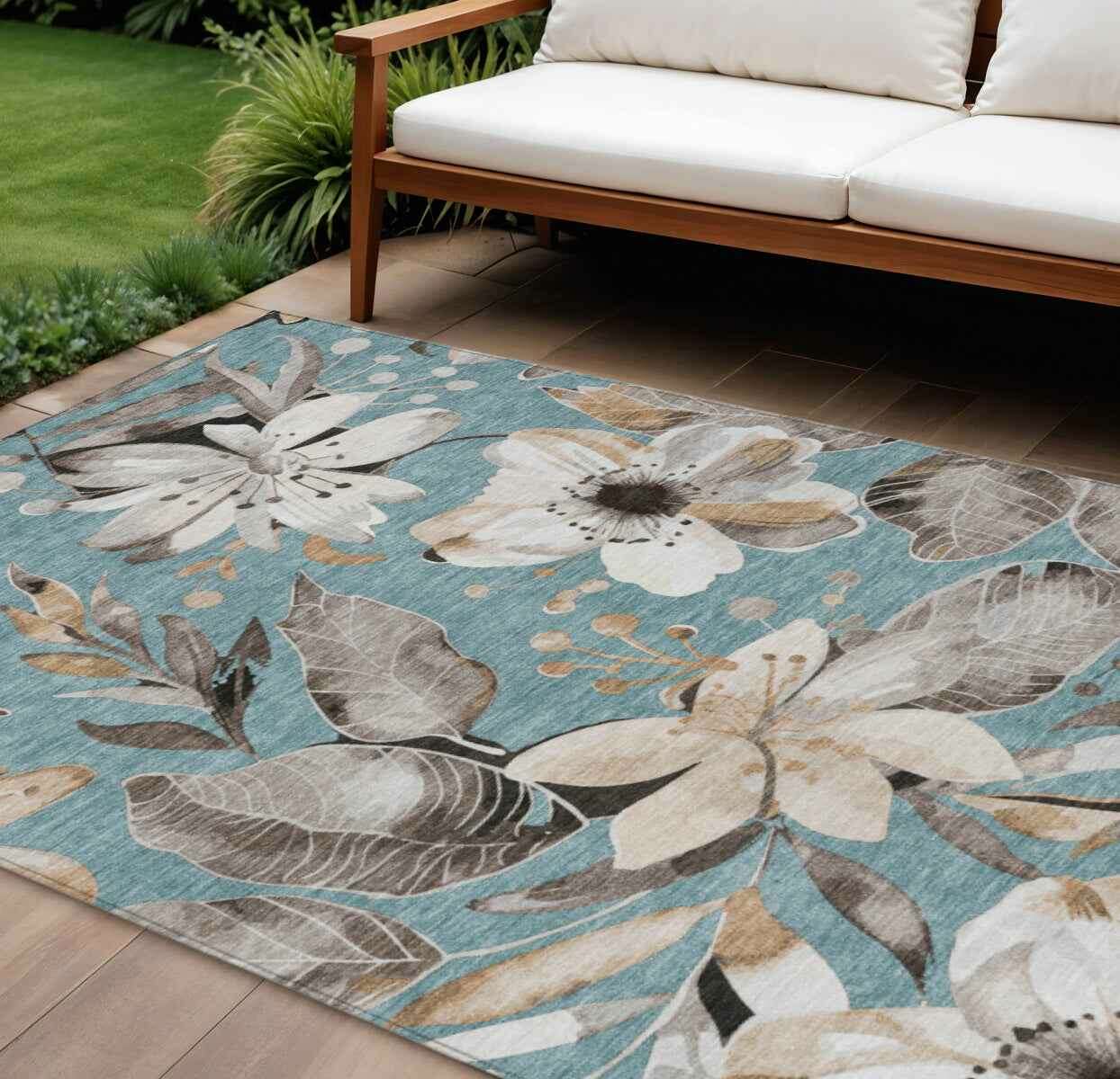 Set an inviting tone in your space with this 10-foot x 14-foot teal blue ivory and charcoal floral washable indoor outdoor area rug. This rectangle shaped rug features a floral design that will work well both indoors or out. A classic shape marries with good looking design for your living room, hall, bedroom, porch, patio, or poolside. Ideal for outdoor spaces or high traffic areas with kids and pets, this rug is made from heavy duty polyester that is stain resistant to help repel water, dirt, and stains. Versatile in use, durable, and easy to maintain, this rug is an ideal solution to add a decorative and inviting touch to your indoor or outdoor space. 120-inch h x 168-inch w x 0.19-inch d.