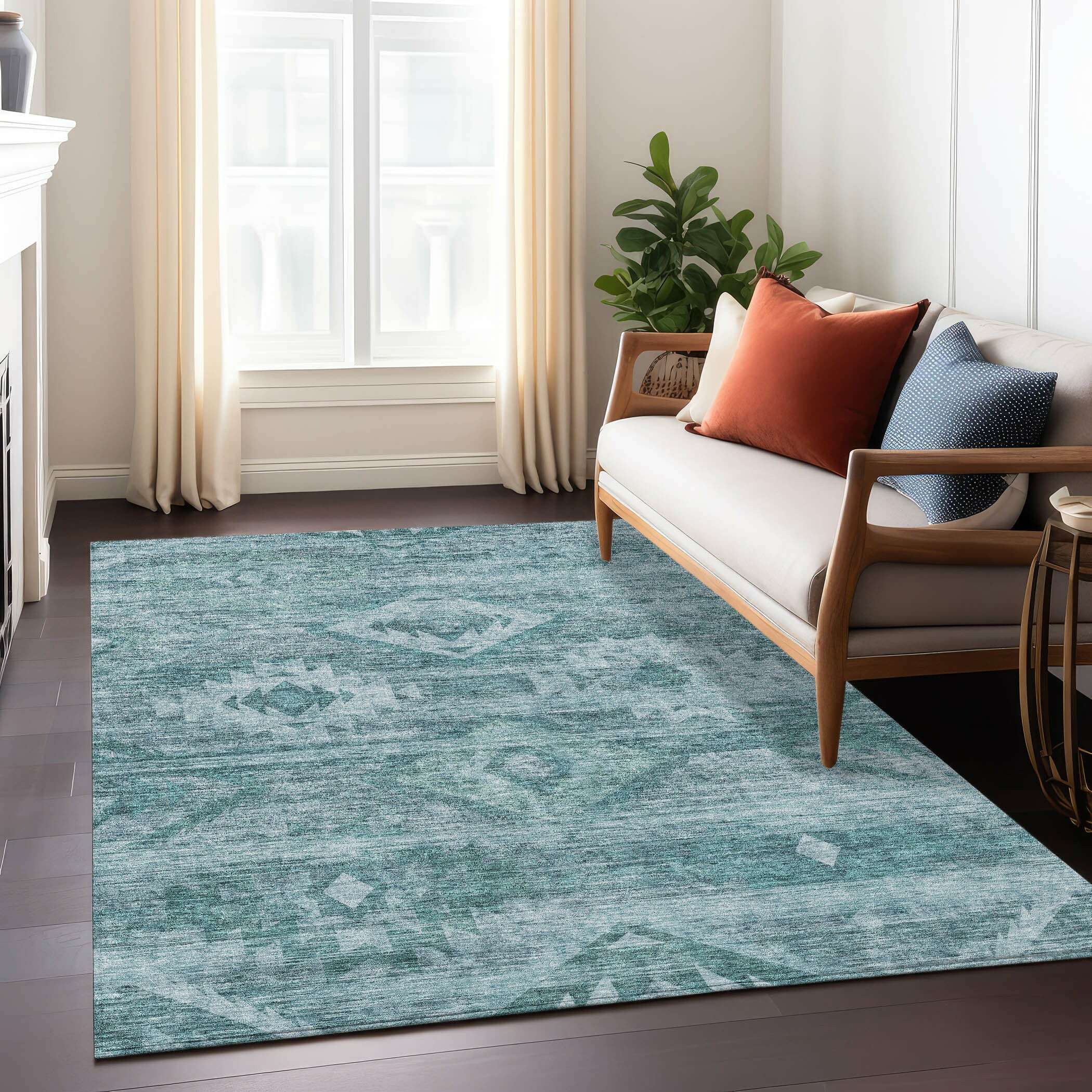 Add some artistry to your room with this 10-foot x 14-foot teal blue and aqua southwestern washable indoor outdoor area rug. This rectangle shaped rug features a southwestern design that will work well both indoors or out. A classic shape marries with good looking design for your living room, hall, bedroom, porch, patio, or poolside. Ideal for outdoor spaces or high traffic areas with kids and pets, this rug is made from heavy duty polyester that is stain resistant to help repel water, dirt, and stains. Makes a great way to dress up your patio, porch, or poolside, but also works well as a durable and easy to maintain option in the kitchen, family room, or mudroom. 120-inch h x 168-inch w x 0.19-inch d.