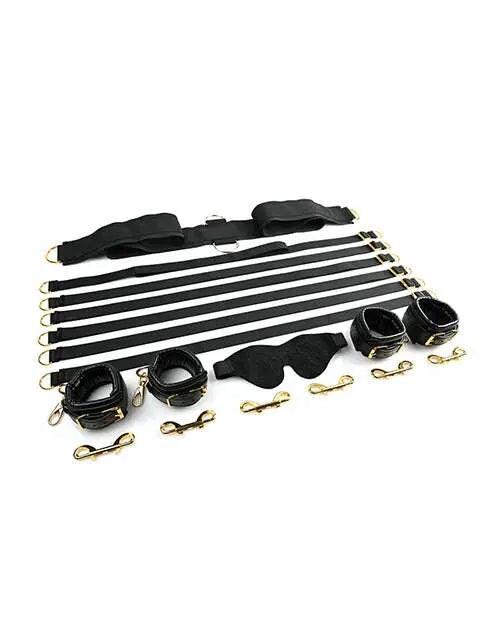 Features: Fits any mattress, Easy to Install.Six adjustable restraint straps. Four high quality faux leather wrist/ankle cuffs with buckle closure. All golden hardware. Six durable, double sided clasps. Thicker, more durable center connector strap. Added soft blindfold. A strong nylon anchor connector strap slides under your mattress to secure six adjustable restraint straps. Four straps end in high quality faux leather wrist and ankle cuffs with golden hardware while two are crafted with loops that promise leverage of all kinds. Position the straps around your mattress just the way you like them, tie your lover down tight, and slip the soft velvet blindfold over their eyes for a session full of surprises. Includes: 4 Wrist/Ankle Cuffs, 6 60 inches Adjustable Restraint Straps, 1 60.5 inches Connector Strap, 6 Golden Double Ended Clasps, 1 Soft Blindfold. Limited Lifetime Warranty, Sportsheets will replace any defective product. If the product is not available, Sportsheets will replace it with a similar product of similar function. Video. 2021.