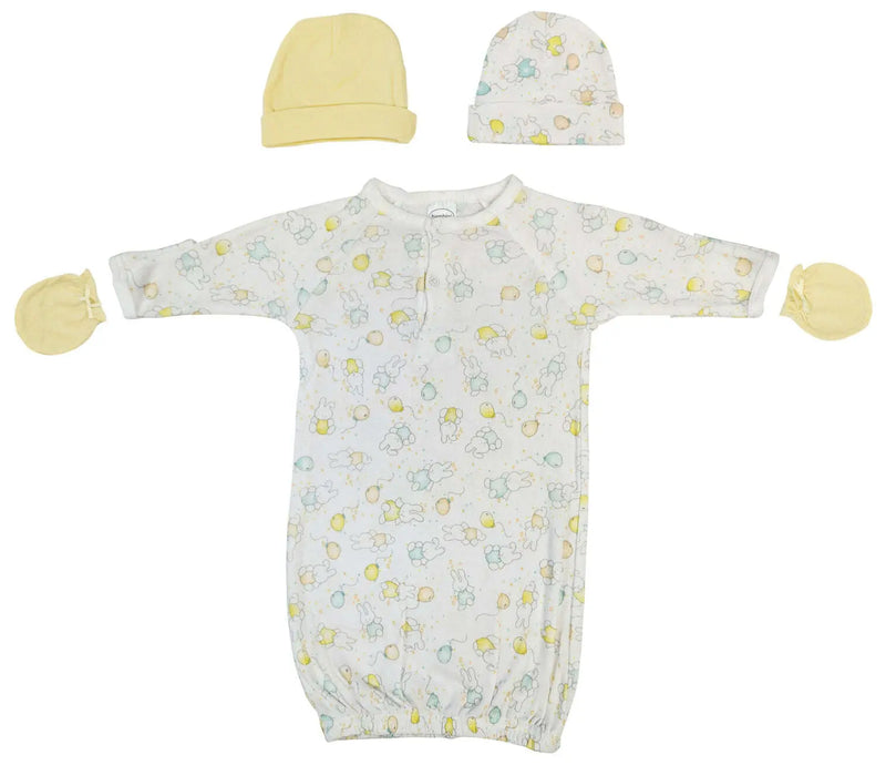 Unisex Print Gown (100% Cotton), Yellow Infant Mittens (Jersey), Yellow Baby Cap (100% Cotton), Printed Baby Cap (100% Cotton)