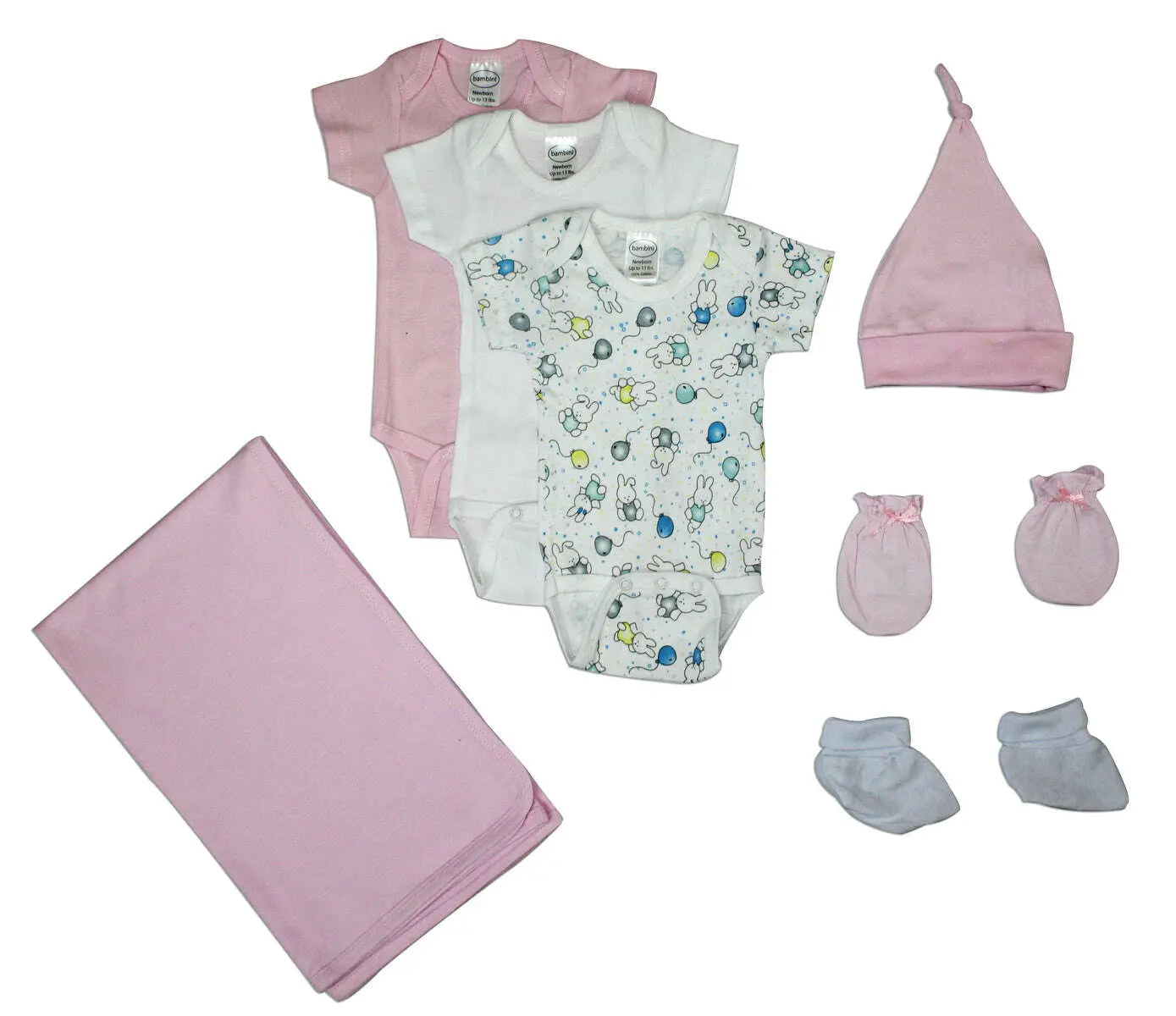 White Booties (100% Cotton), Short Sleeve Onezie 3 Pack (100% Cotton), Pink Knotted Baby Cap (100% Cotton), Pink Infant Mittens (Jersey), Pink Receiving Blanket (100% Cotton)