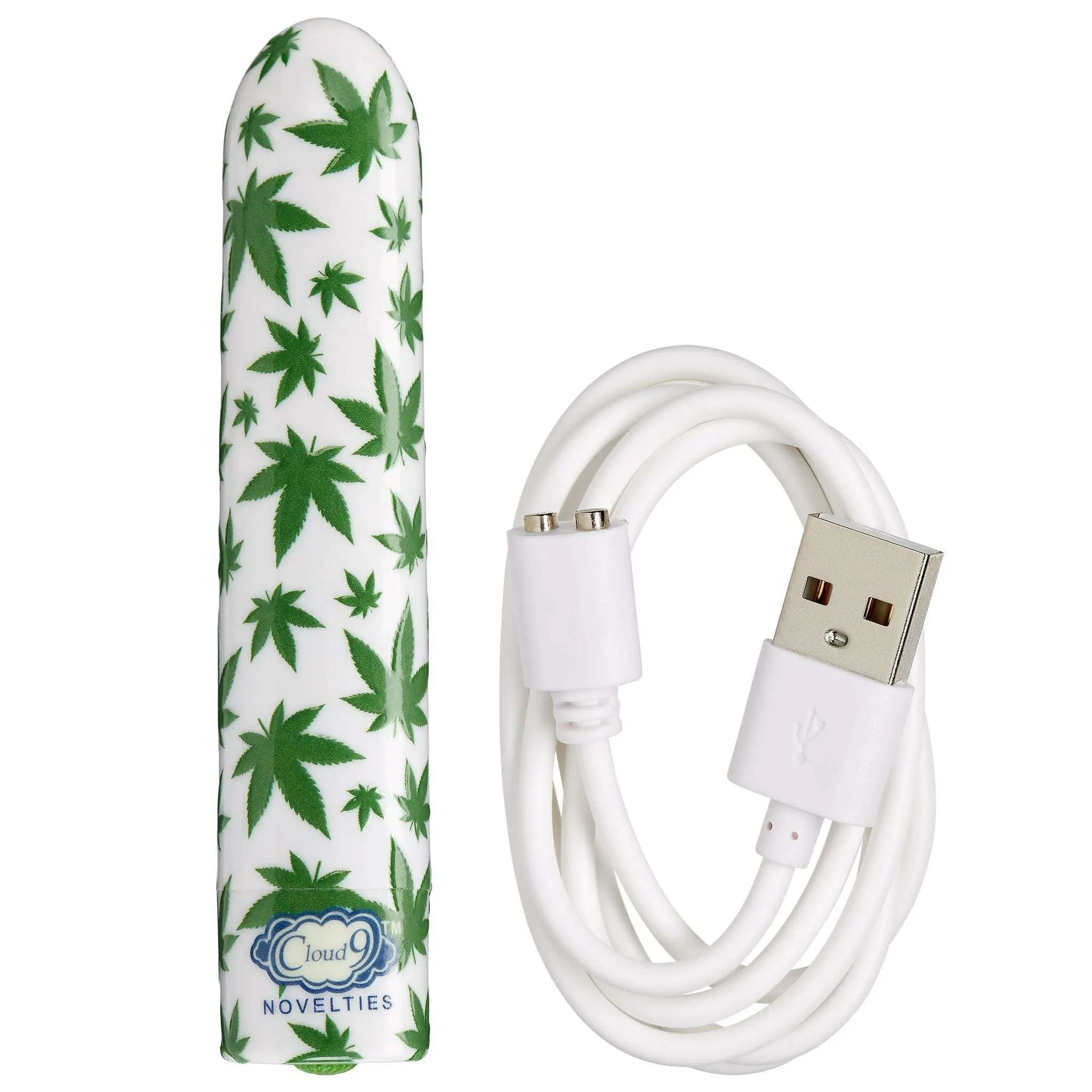 Slim Vibe Personal Vibrator White Cannabis Leaf from Cloud 9 Novelties. Celebrate the cannabis culture with a discreet and petite rechargeable bullet vibrator. This uniquely patterned Cloud 9 Novelty Vibrator fearures 10 speeds of vibration patterns and an ergonomic shape the Vibe features a powerful motor. Perfect when on the go. This Vibe is silky smooth with a velvety feel for comfort. The strong motor delivers intense vibrations that will take you to new heights.