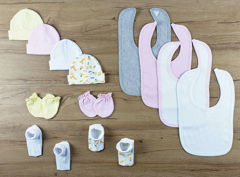 White Booties (100% Cotton), White Booties (100% Cotton), Yellow Infant Mittens (Jersey), Pink Infant Mittens (Jersey), Pink Interlock Bib (100% Cotton), White Interlock Bib (100% Cotton), Pink Interlock Bib (100% Cotton), Heather Grey Interlock Bib (100% Cotton), Yellow Baby Cap (100% Cotton), Pink Baby Cap (100% Cotton), White Baby Cap (100% Cotton), Printed Baby Cap (100% Cotton)