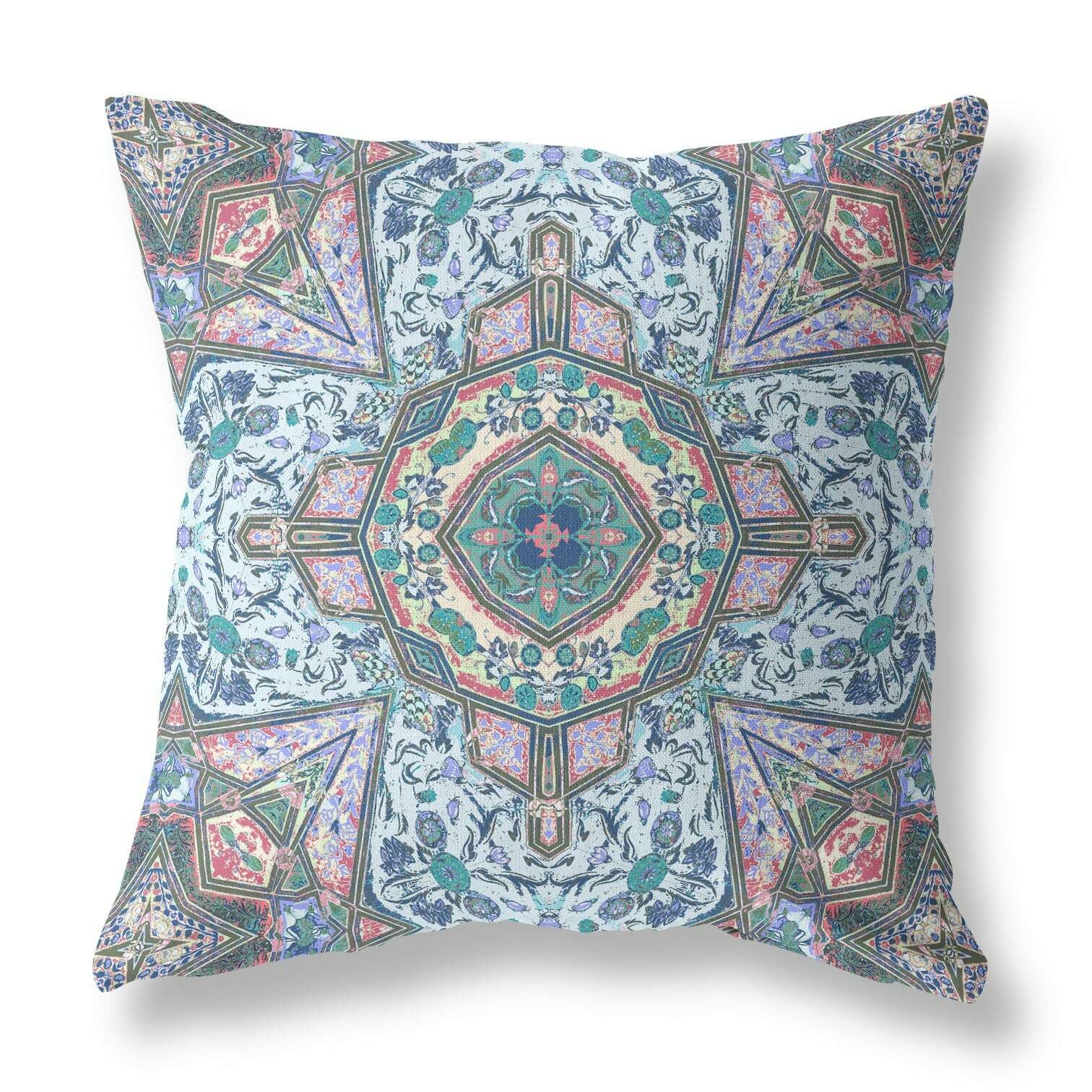 Combining a modern palette with traditional motifs, this stunning Pale Blue Pink Medallion Indoor Outdoor Throw Pillow is a new take on classic designs to suit modern décor needs perfectly. The use of soft blue and pink tones creates a mesmerizing floral medallion in a subtle contrast that is bound to stun the guests in awe. Made with the finest broadcloth fabric, the pillow boasts longevity and sturdiness, ideal for both indoor and outdoor use. The plush look and fluffy nature come from the regular polyfill insert that provides a comfortable platform for your head and neck to maximize relaxation. The beautiful print work is made of the highest quality to ensure the pristine look stays perfect for years to come. Pair this decorative throw pillow with bold or bright decors and it will seamlessly blend into a wide variety of setting while adding a sense of calm and comfort to the room. 16” x 16” x 5”