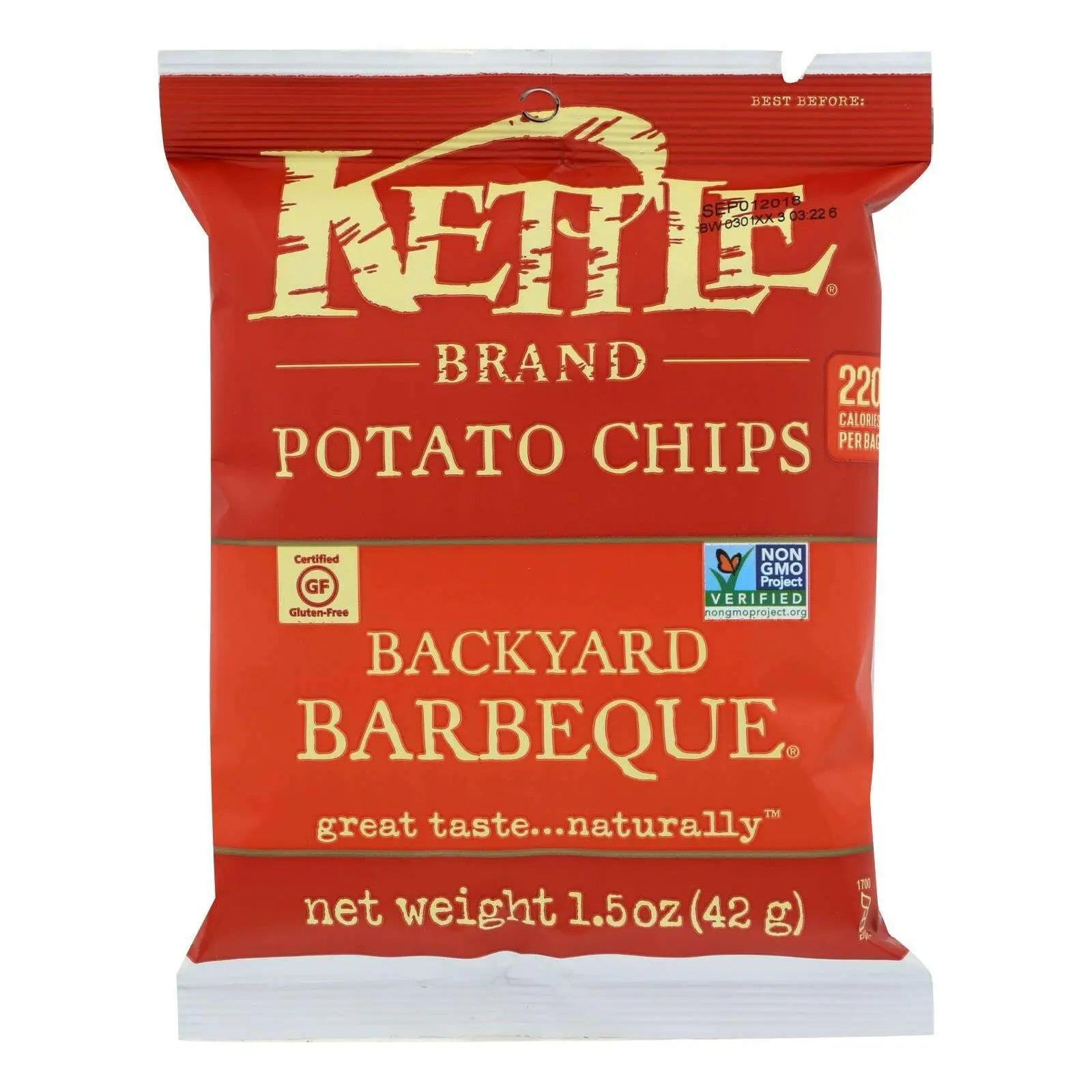 Kettle brand backyard barbecue potato chips get their great taste from paprika, onion, garlic and chili pepper seasonings, making them a flavorful addition to your school lunch or picnic basket. This single-serve 1.5 oz. Bag of chips contains no trans fat or cholesterol and adds 3 g. Of protein to your diet. We guarantee its freshness through the best-before date.